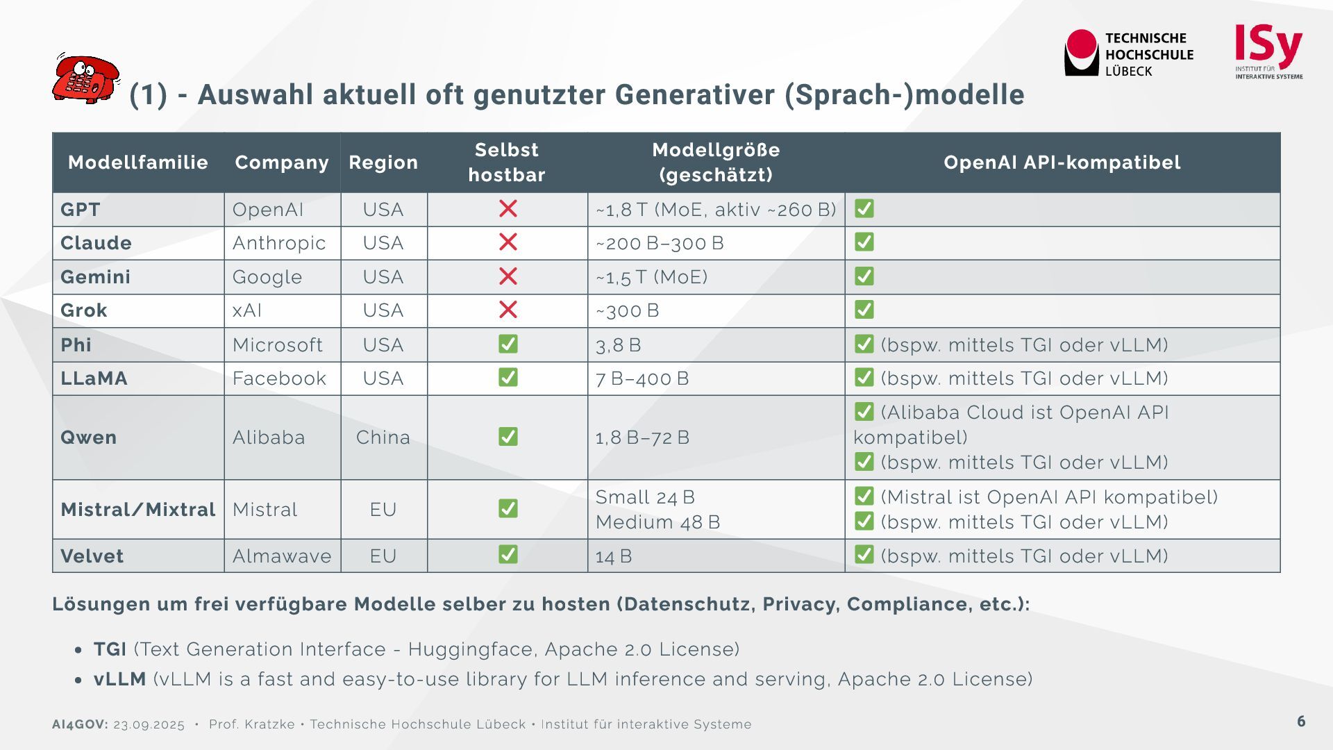 Region Selbst hostbar Modellgröße (geschätzt) OpenAI API-kompatibel GPT OpenAI USA ~1,8 T (MoE, aktiv ~260 B) Claude Anthropic USA ~200 B–300 B Gemini Google USA ~1,5 T (MoE) Grok xAI USA ~300 B Phi Microsoft USA 3,8 B (bspw. mittels TGI oder vLLM) LLaMA Facebook USA 7 B–400 B (bspw. mittels TGI oder vLLM) Qwen Alibaba China 1,8 B–72 B (Alibaba Cloud ist OpenAI API kompatibel) (bspw. mittels TGI oder vLLM) Mistral/Mixtral Mistral EU Small 24 B Medium 48 B (Mistral ist OpenAI API kompatibel) (bspw. mittels TGI oder vLLM) Velvet Almawave EU 14 B (bspw. mittels TGI oder vLLM) Lösungen um frei verfügbare Modelle selber zu hosten (Datenschutz, Privacy, Compliance, etc.): TGI (Text Generation Interface - Huggingface, Apache 2.0 License) vLLM (vLLM is a fast and easy-to-use library for LLM inference and serving, Apache 2.0 License) AI4GOV: 23.09.2025 • Prof. Kratzke • Technische Hochschule Lübeck • Institut für interaktive Systeme 6