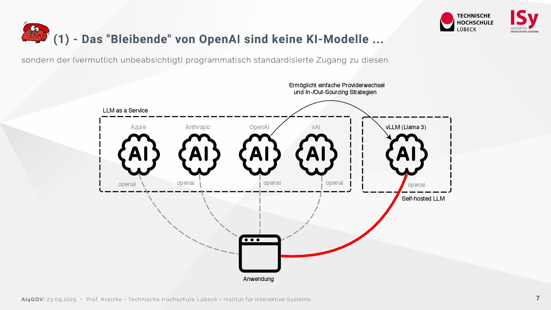 sondern der (vermutlich unbeabsichtigt) programmatisch standardisierte Zugang zu diesen. OpenAI Anwendung Anthropic xAI Azure vLLM (Llama 3) LLM as a Service Self-hosted LLM openai openai openai openai Ermöglicht einfache Providerwechsel und In-/Out-Sourcing Strategien openai AI4GOV: 23.09.2025 • Prof. Kratzke • Technische Hochschule Lübeck • Institut für interaktive Systeme 7