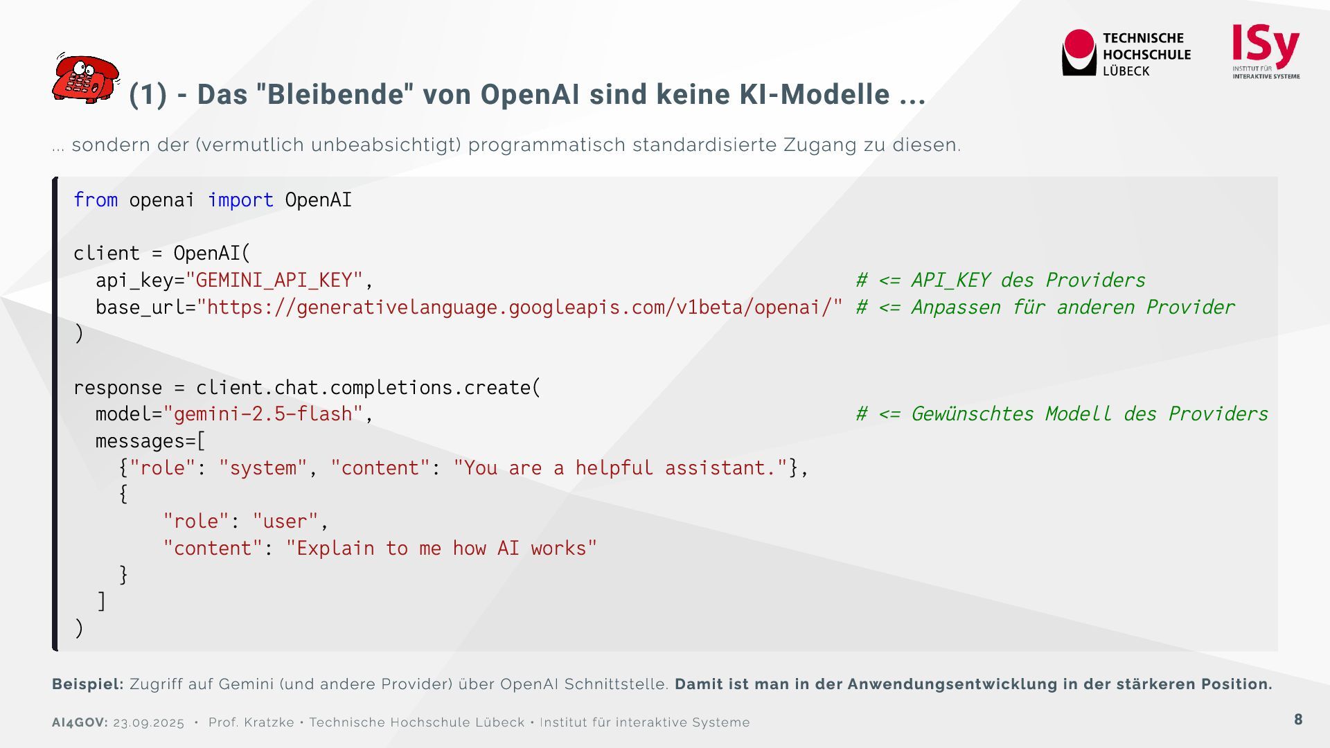 ... sondern der (vermutlich unbeabsichtigt) programmatisch standardisierte Zugang zu diesen. from openai import OpenAI client = OpenAI( api_key="GEMINI_API_KEY", # <= API_KEY des Providers base_url="https://generativelanguage.googleapis.com/v1beta/openai/" # <= Anpassen für anderen Provider ) response = client.chat.completions.create( model="gemini-2.5-flash", # <= Gewünschtes Modell des Providers messages=[ {"role": "system", "content": "You are a helpful assistant."}, { "role": "user", "content": "Explain to me how AI works" } ] ) Beispiel: Zugriff auf Gemini (und andere Provider) über OpenAI Schnittstelle. Damit ist man in der Anwendungsentwicklung in der stärkeren Position. AI4GOV: 23.09.2025 • Prof. Kratzke • Technische Hochschule Lübeck • Institut für interaktive Systeme 8