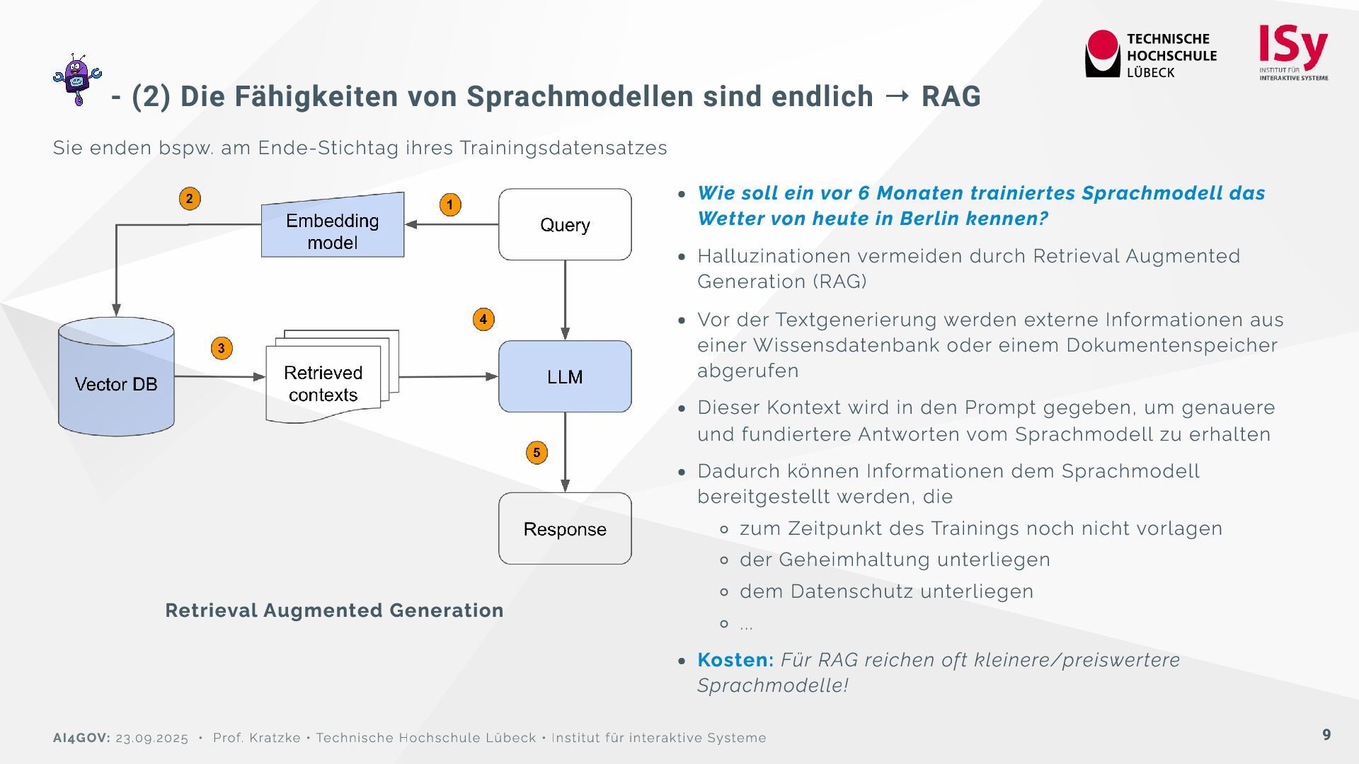 Sie enden bspw. am Ende-Stichtag ihres Trainingsdatensatzes Retrieval Augmented Generation Wie soll ein vor 6 Monaten trainiertes Sprachmodell das Wetter von heute in Berlin kennen? Halluzinationen vermeiden durch Retrieval Augmented Generation (RAG) Vor der Textgenerierung werden externe Informationen aus einer Wissensdatenbank oder einem Dokumentenspeicher abgerufen Dieser Kontext wird in den Prompt gegeben, um genauere und fundiertere Antworten vom Sprachmodell zu erhalten Dadurch können Informationen dem Sprachmodell bereitgestellt werden, die zum Zeitpunkt des Trainings noch nicht vorlagen der Geheimhaltung unterliegen dem Datenschutz unterliegen ... Kosten: Für RAG reichen oft kleinere/preiswertere Sprachmodelle! AI4GOV: 23.09.2025 • Prof. Kratzke • Technische Hochschule Lübeck • Institut für interaktive Systeme 9