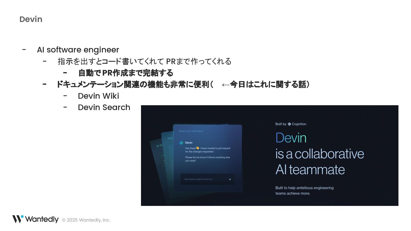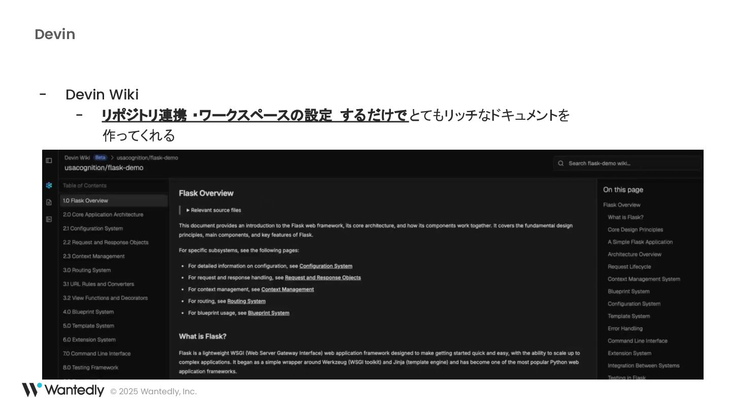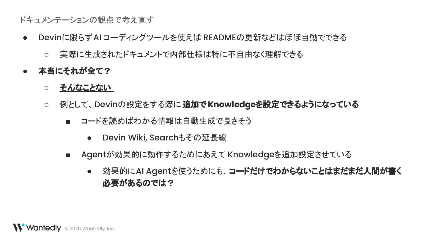 実際に生成されたドキュメントで内部仕様は特に不自由なく理解できる • 本当にそれが全て? ◦ そんなことない ◦ 例として、Devinの設定をする際に追加でKnowledgeを設定できるようになっている ▪ コードを読めばわかる情報は自動生成で良さそう • Devin Wiki, Searchもその延長線 ▪ Agentが効果的に動作するためにあえて Knowledgeを追加設定させている • 効果的にAI Agentを使うためにも、コードだけでわからないことはまだまだ人間が書く 必要があるのでは?