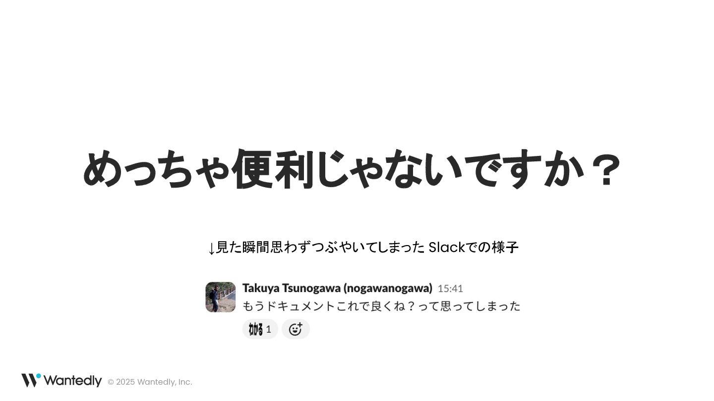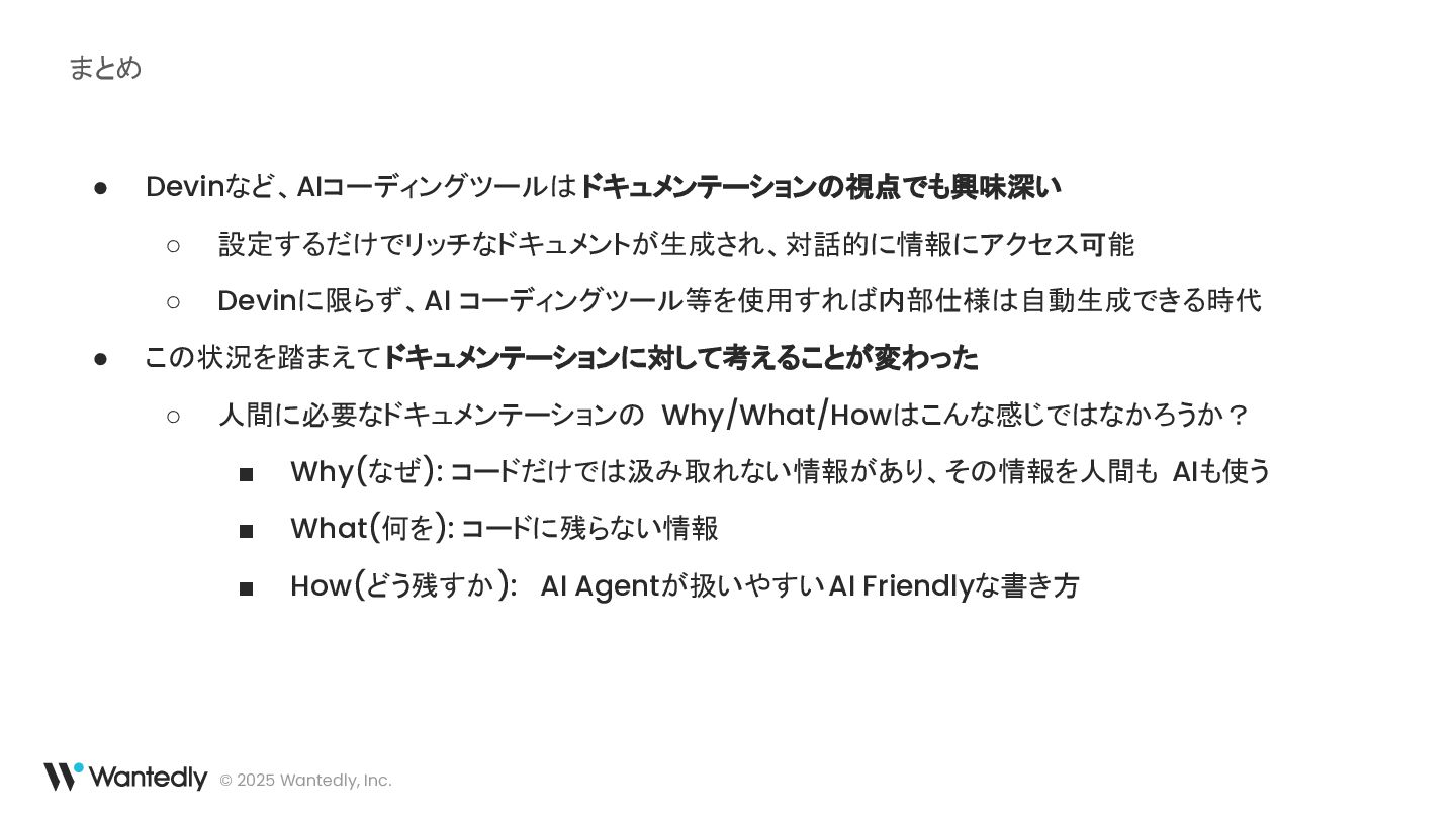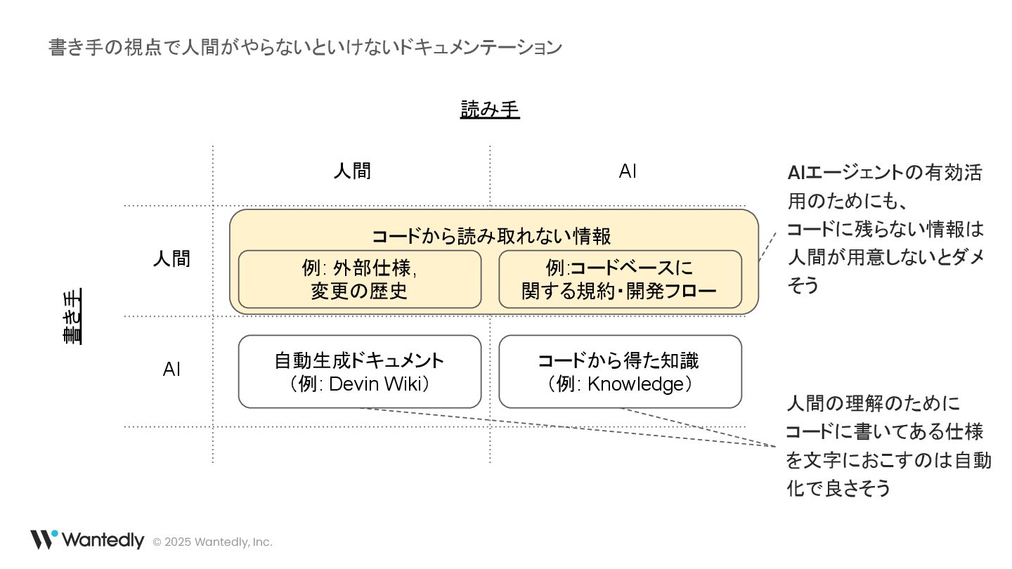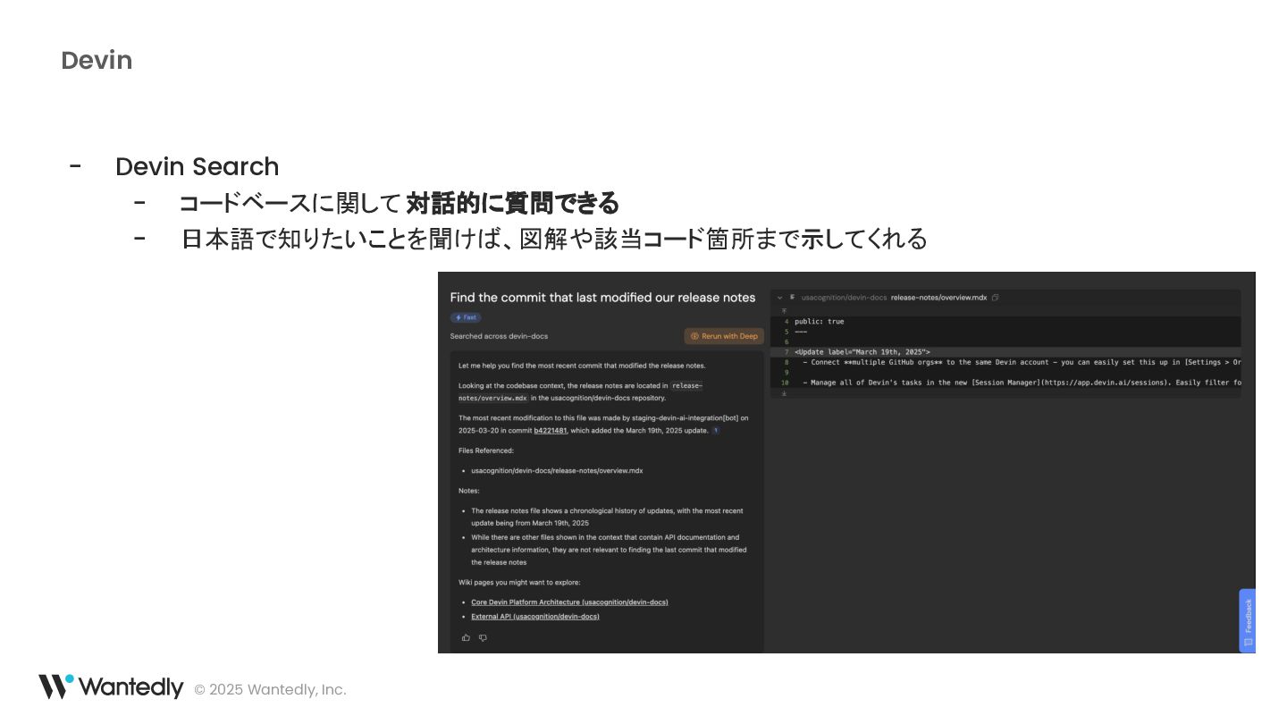 実際に生成されたドキュメントで内部仕様は特に不自由なく理解できる • 本当にそれが全て? ◦ そんなことない ◦ 例として、Devinの設定をする際に追加でKnowledgeを設定できるようになっている ▪ コードを読めばわかる情報は自動生成で良さそう • Devin Wiki, Searchもその延長線 ▪ Agentが効果的に動作するためにあえて Knowledgeを追加設定させている • 効果的にAI Agentを使うためにも、コードだけでわからないことはまだまだ人間が書く 必要があるのでは?