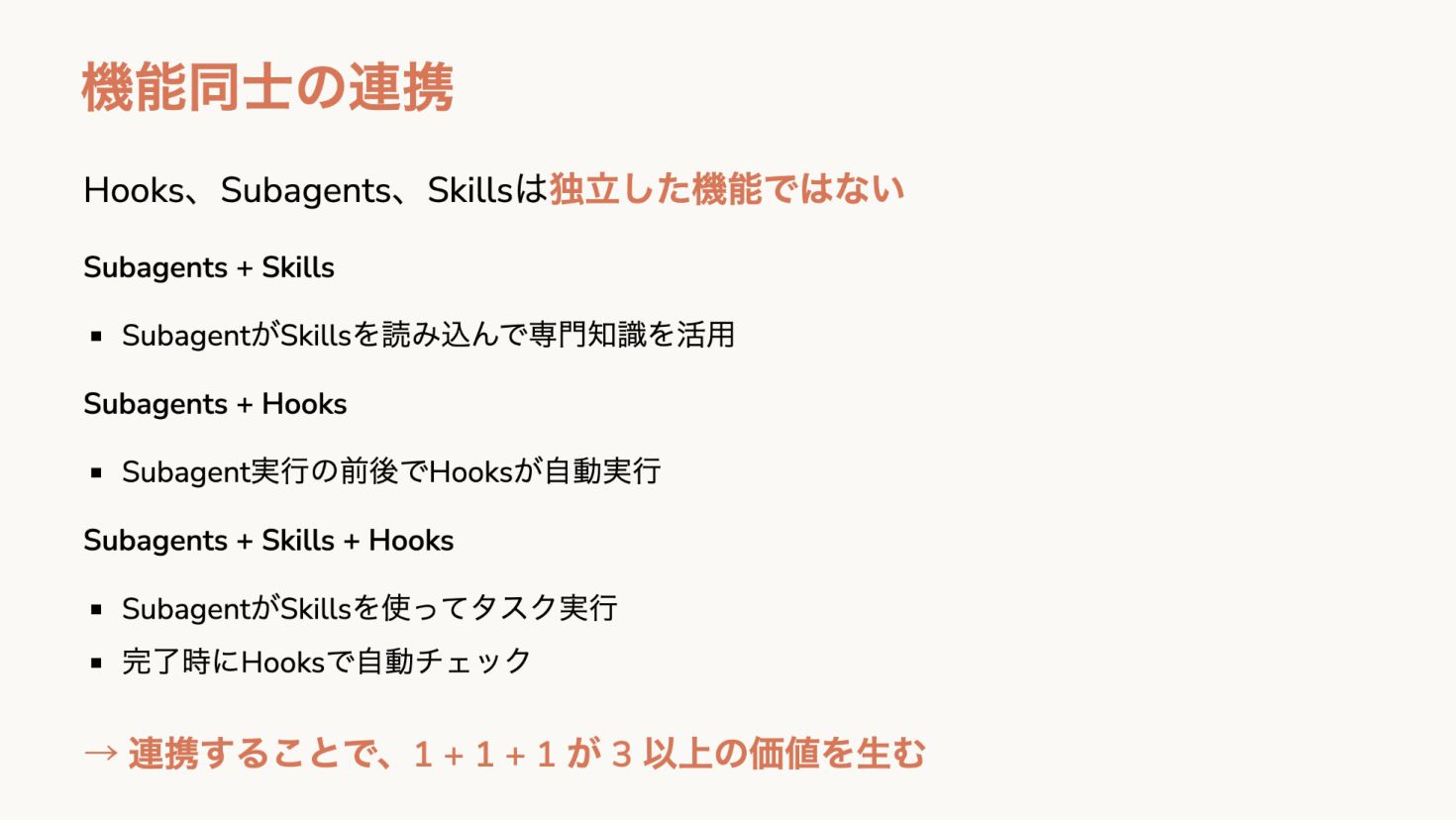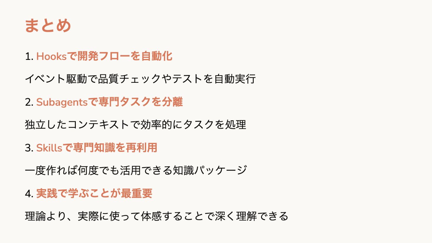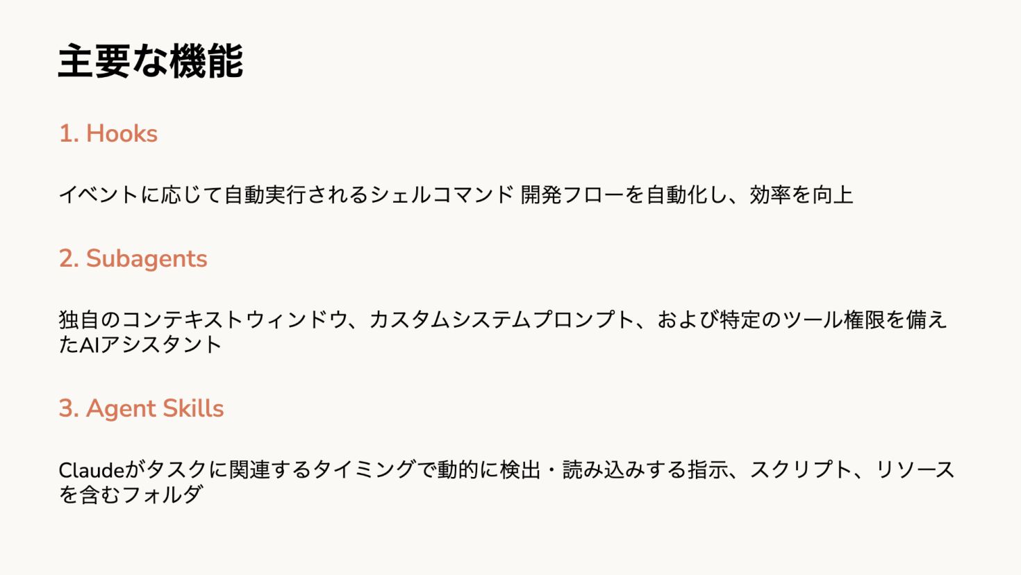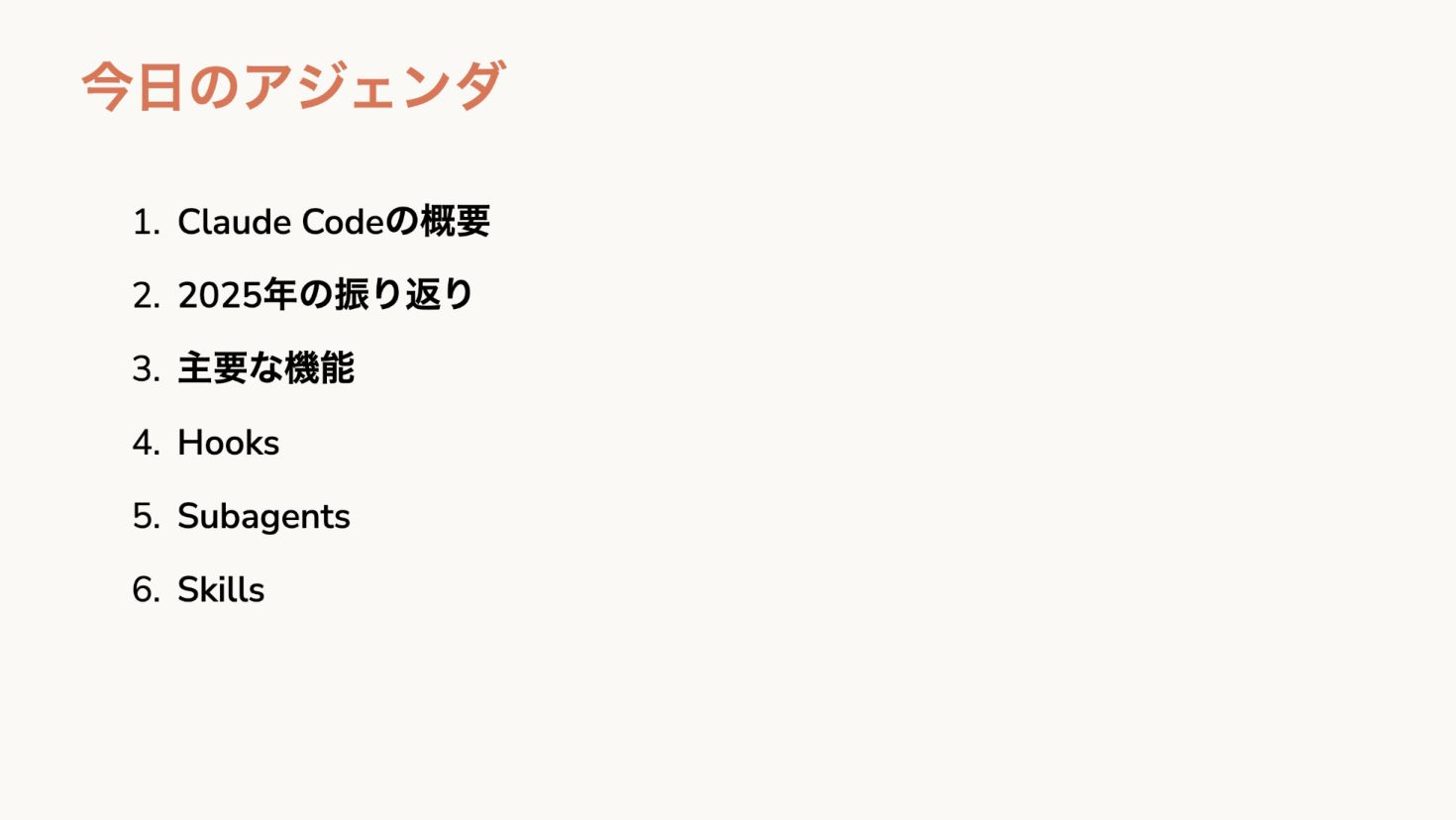 ・Claude Codeの概要と2025年の主要アップデート ・Hooks:イベント駆動の開発フロー自動化 ・Subagents:特化型AIアシスタントによる効率的なタスク分離 ・Agent Skills:再利用可能な専門知識パッケージ ・3つの機能を組み合わせた実践的なワークフロー事例