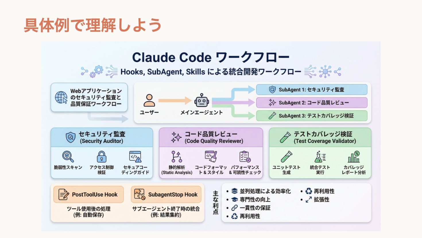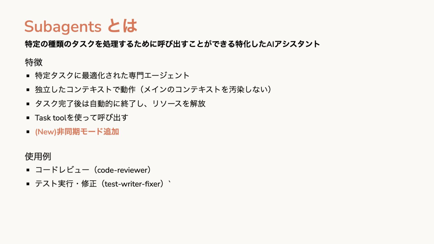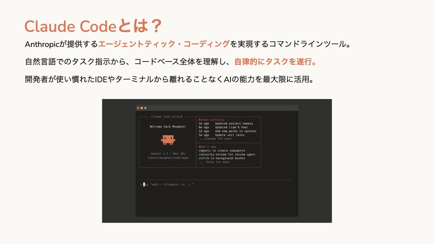 ・Claude Codeの概要と2025年の主要アップデート ・Hooks:イベント駆動の開発フロー自動化 ・Subagents:特化型AIアシスタントによる効率的なタスク分離 ・Agent Skills:再利用可能な専門知識パッケージ ・3つの機能を組み合わせた実践的なワークフロー事例
