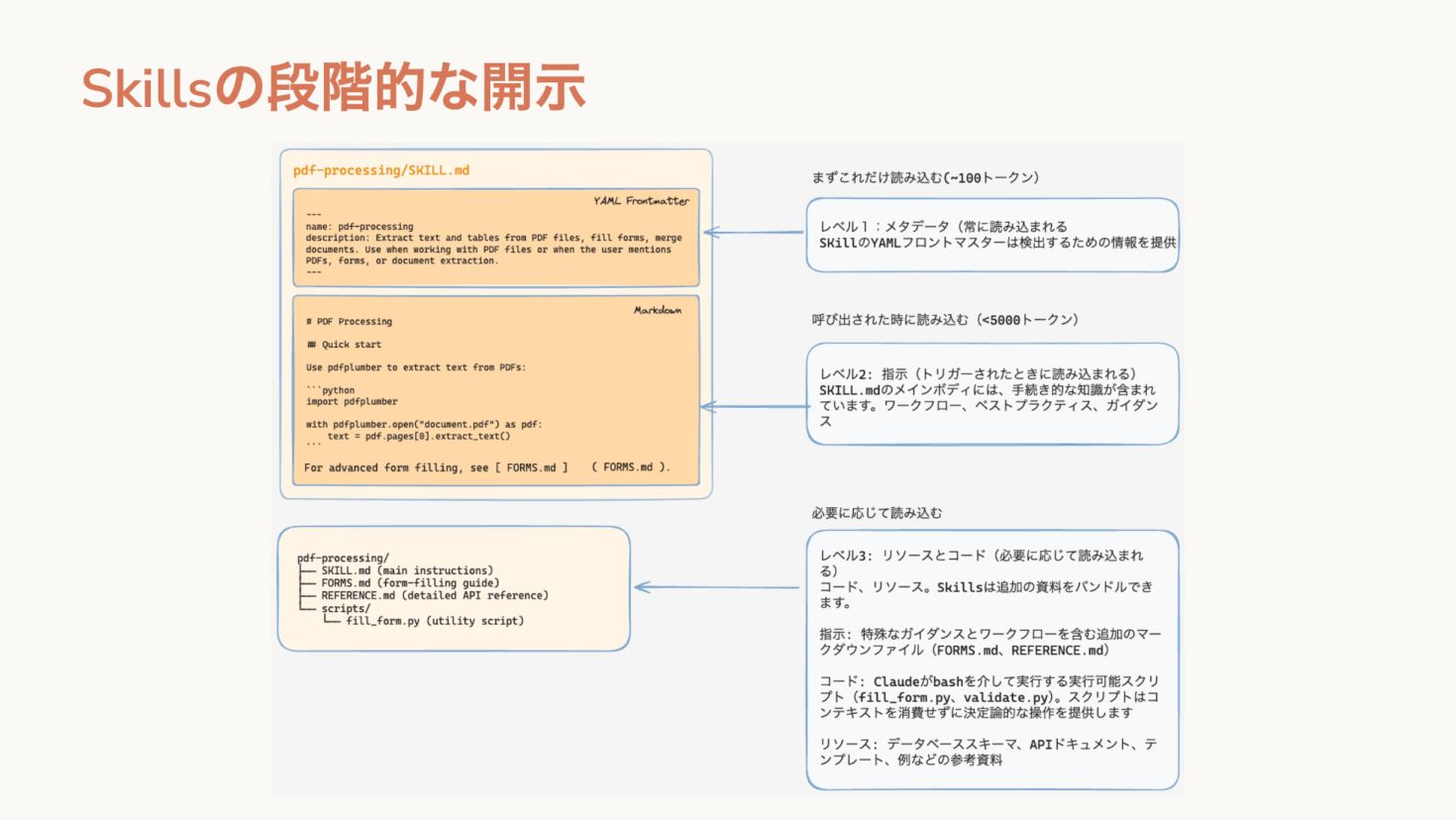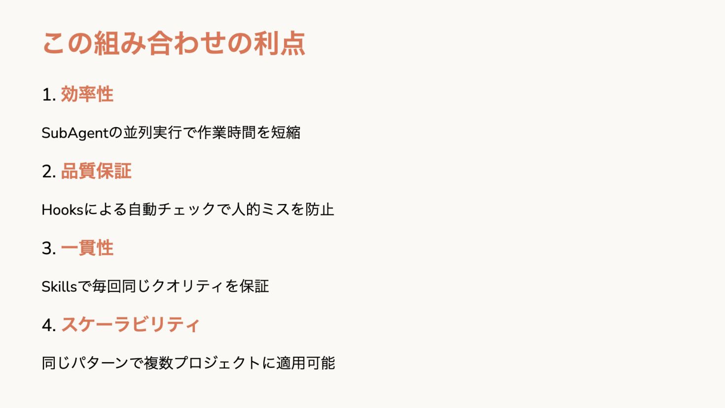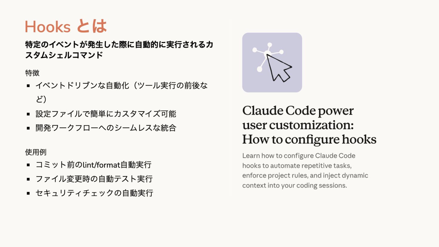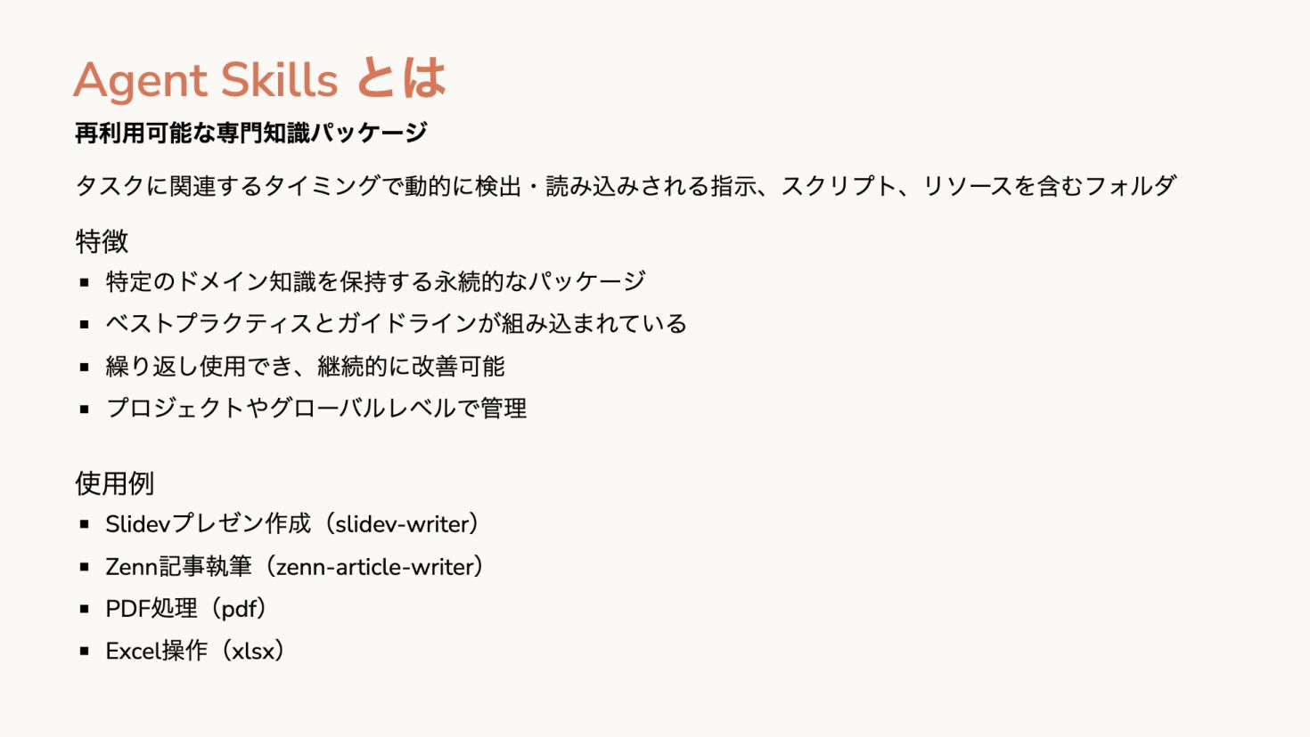 ・Claude Codeの概要と2025年の主要アップデート ・Hooks:イベント駆動の開発フロー自動化 ・Subagents:特化型AIアシスタントによる効率的なタスク分離 ・Agent Skills:再利用可能な専門知識パッケージ ・3つの機能を組み合わせた実践的なワークフロー事例
