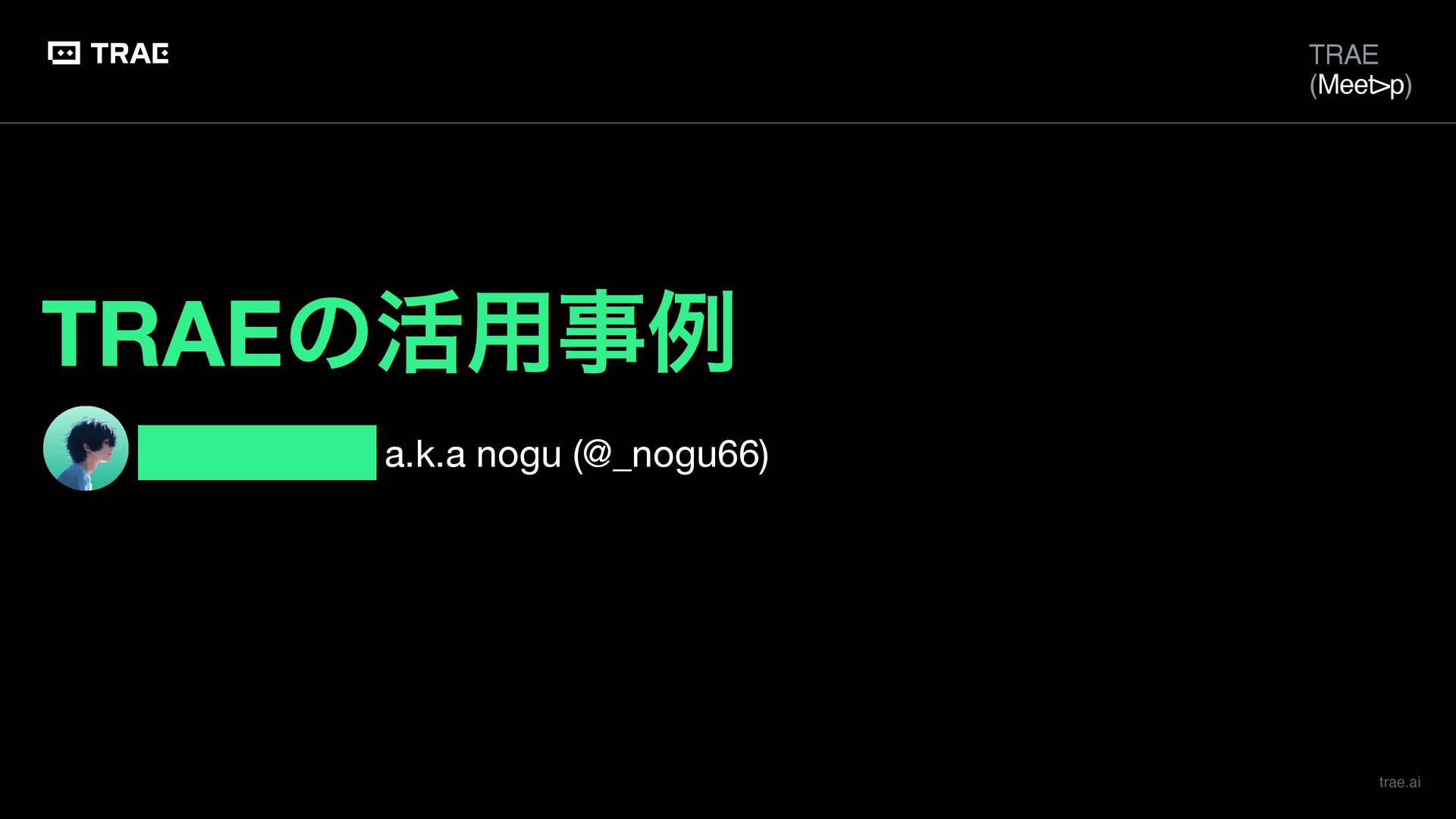 trae.ai TRAE (Meet>p) TRAEͷ׆༻ࣄྫ Yuta Noguchi a.k.a nogu (@_nogu66)