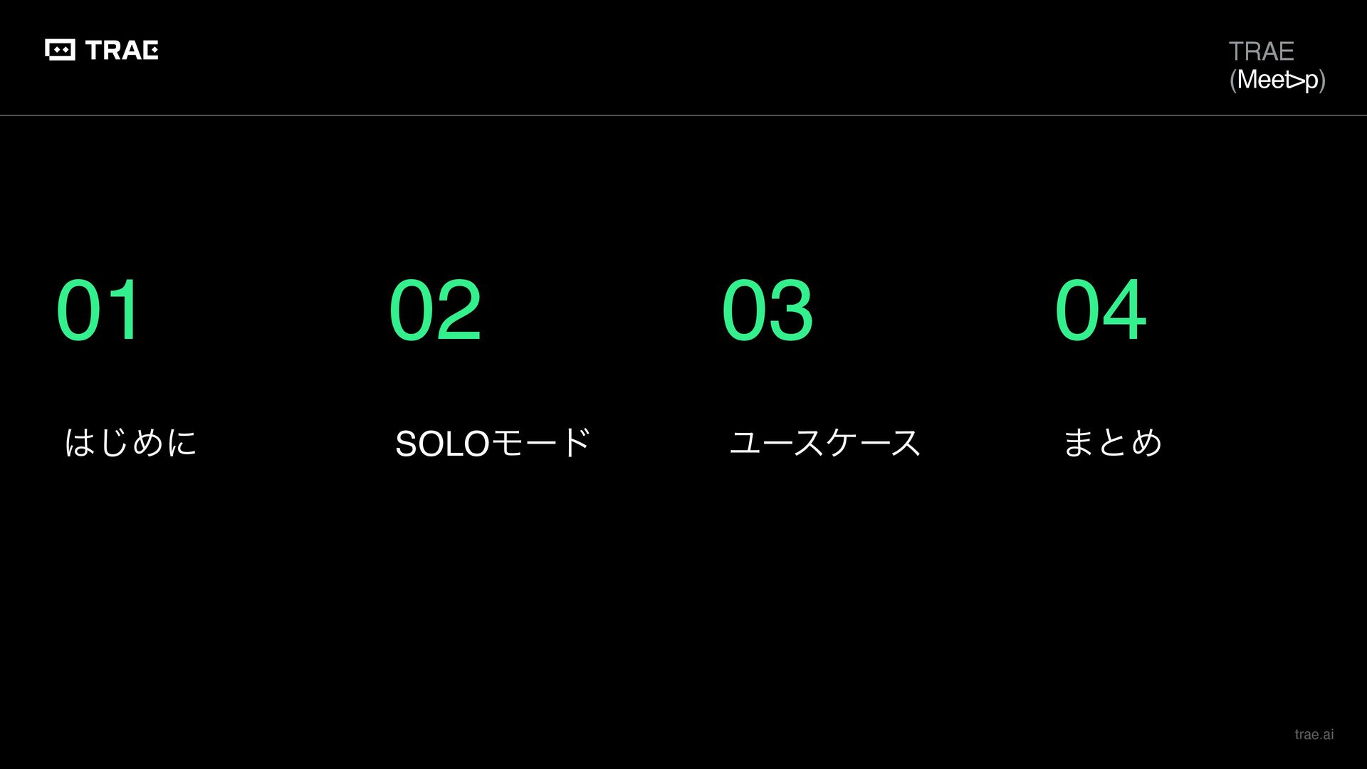 trae.ai TRAE (Meet>p) 01 ͡Ίʹ 02 SOLOϞʔυ 03 Ϣʔεέʔε 04