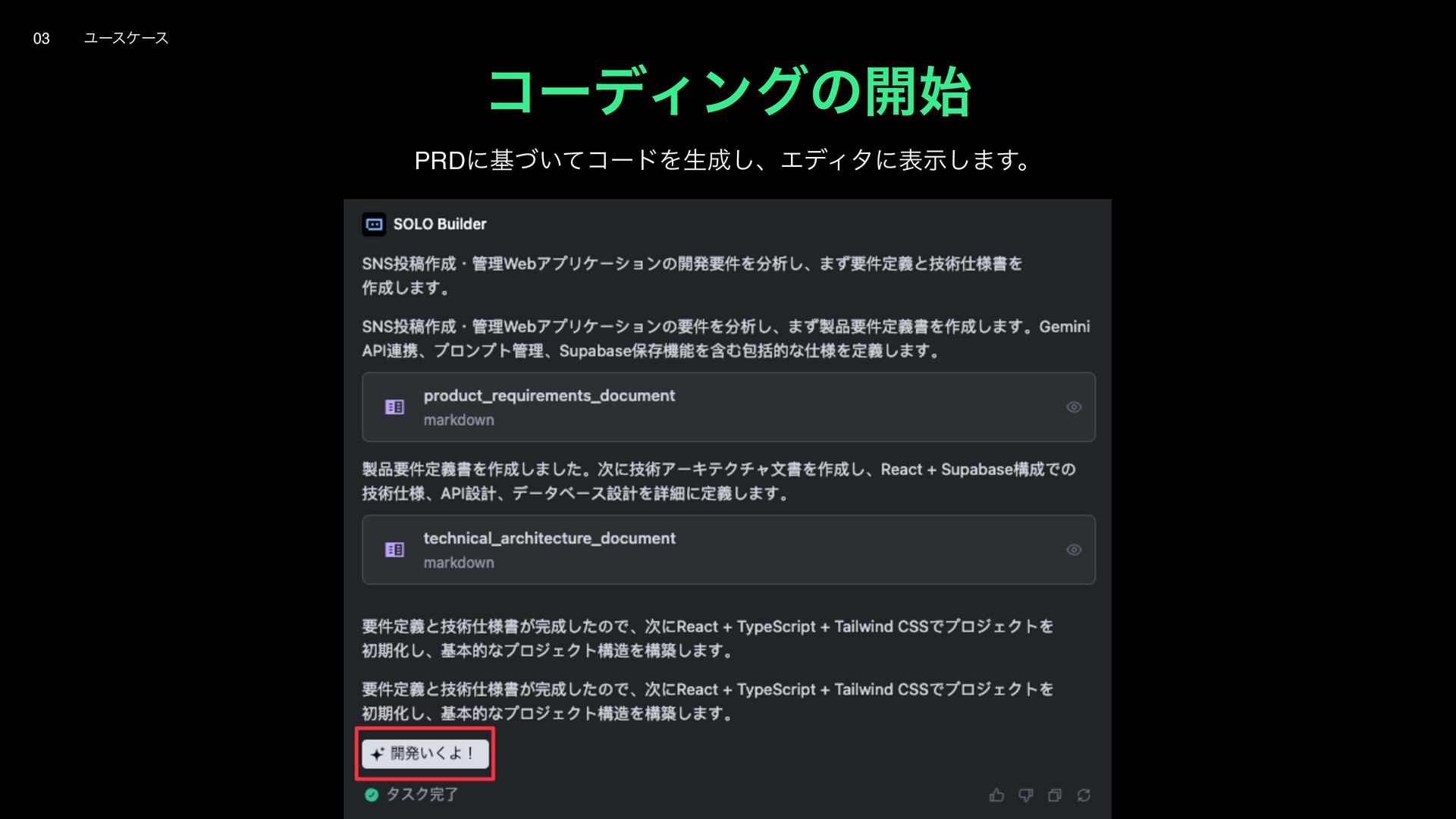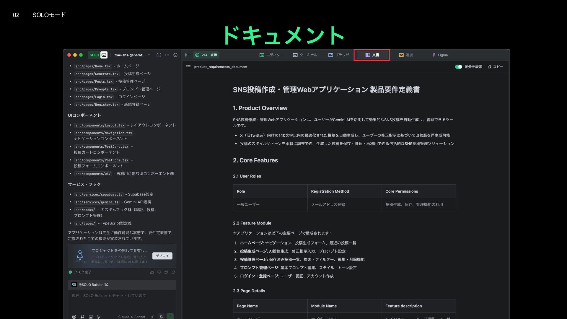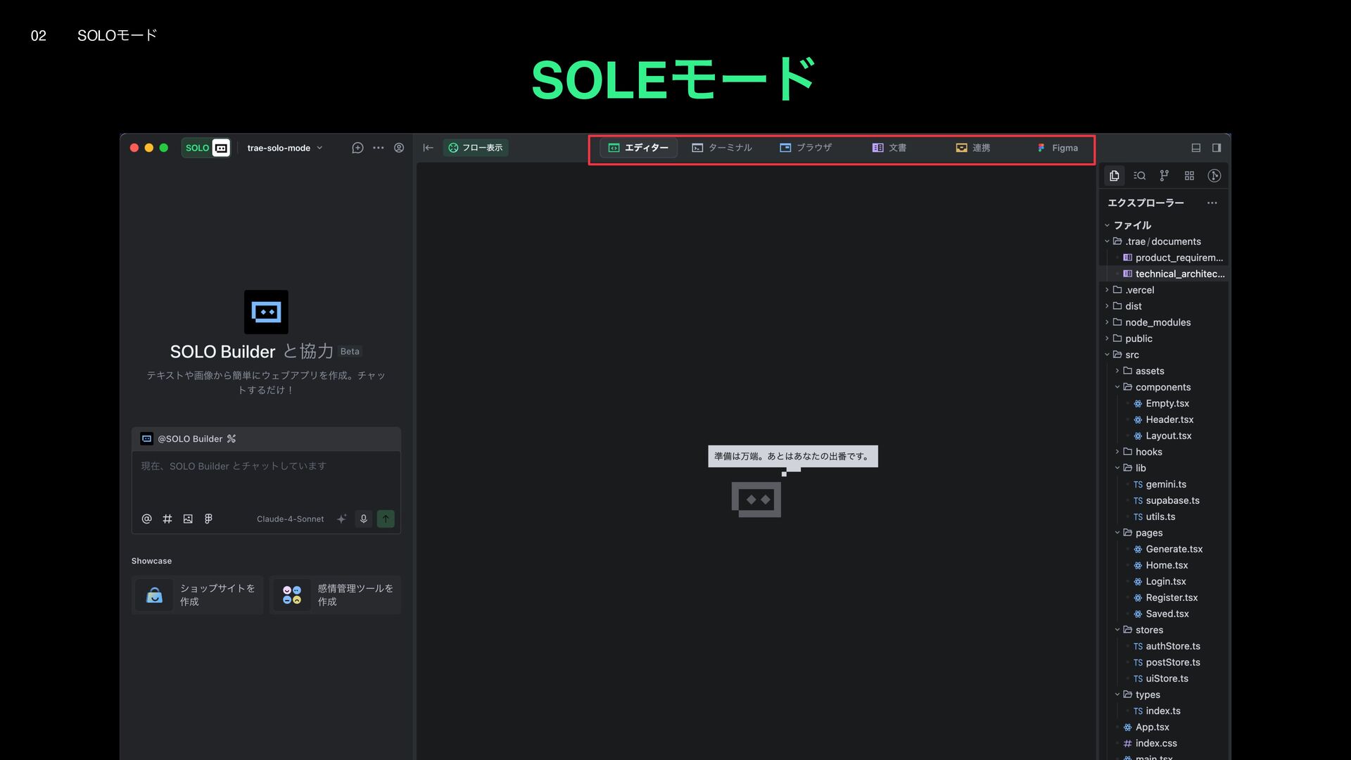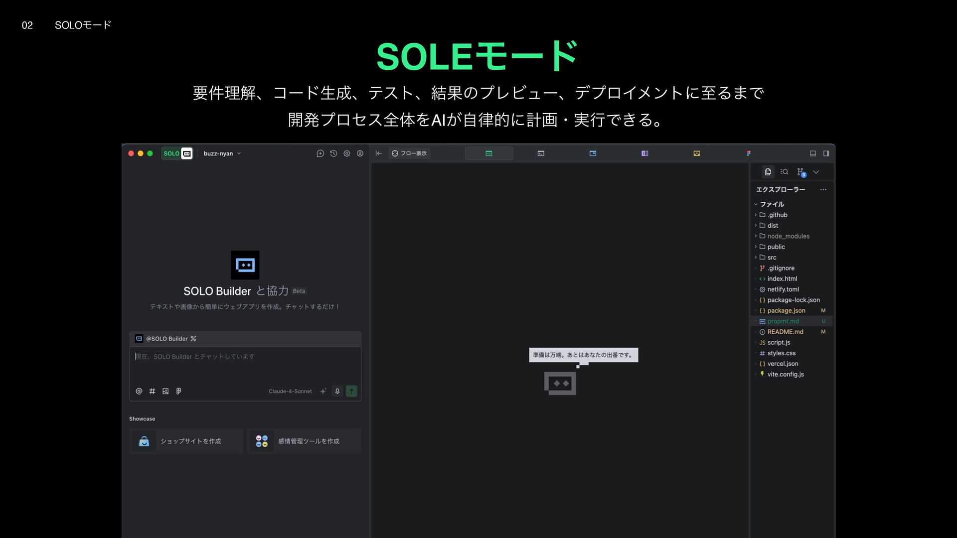 02 SOLOϞʔυ SOLEϞʔυ ཁ݅ཧղɺίʔυੜɺςετɺ݁ՌͷϓϨϏϡʔɺσϓϩΠϝϯτʹࢸΔ·Ͱ ։ൃϓϩηεશମΛAI͕ࣗతʹܭըɾ࣮ߦͰ͖Δɻ