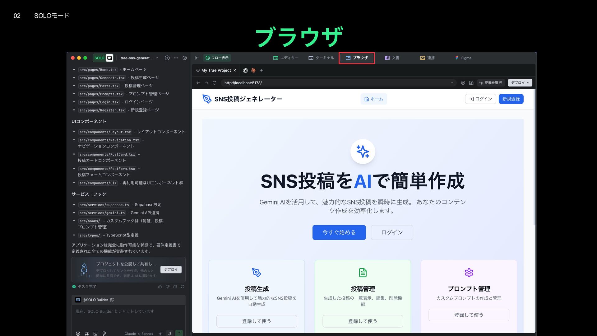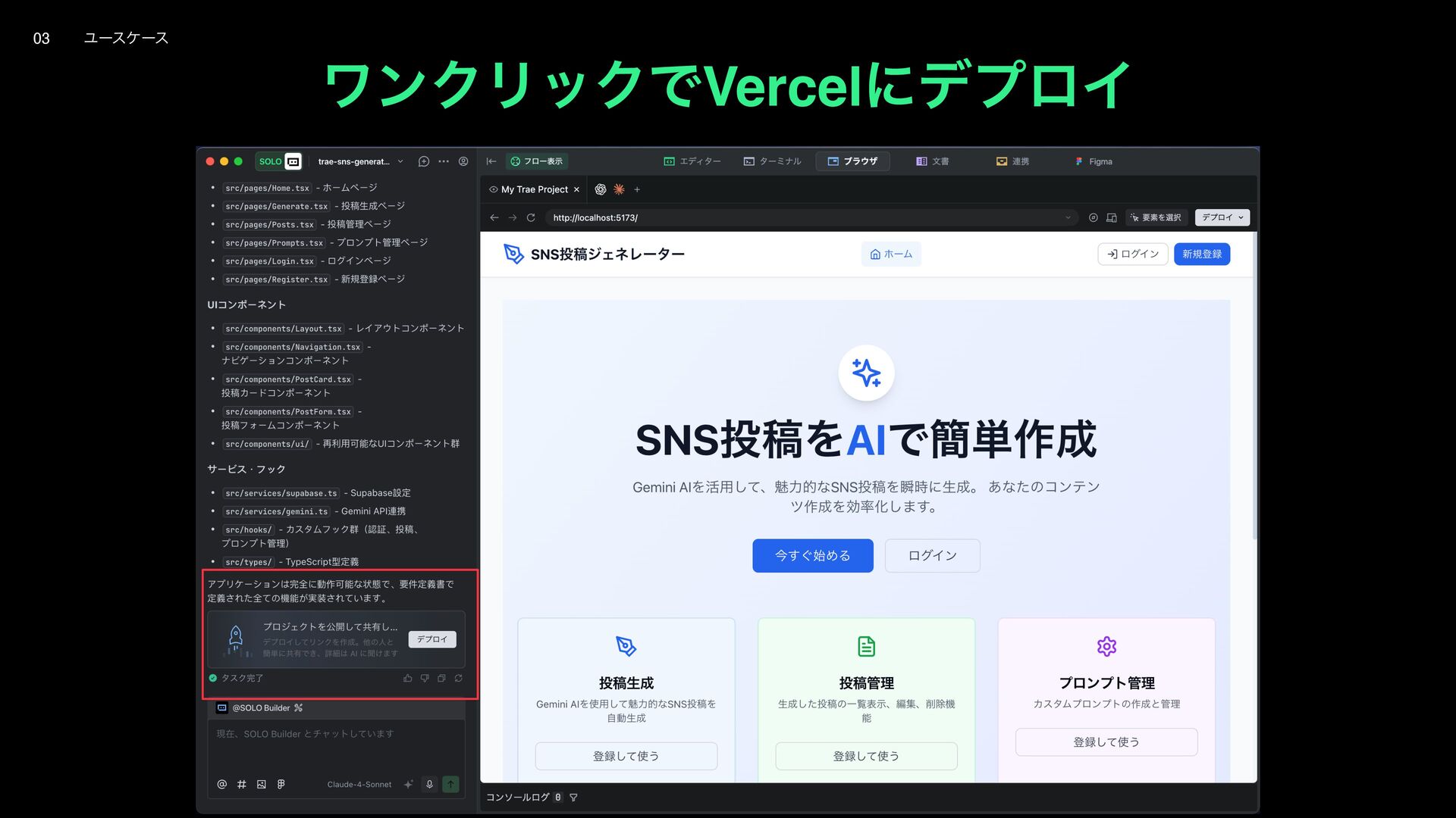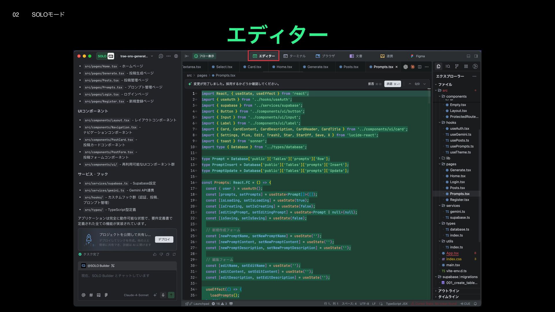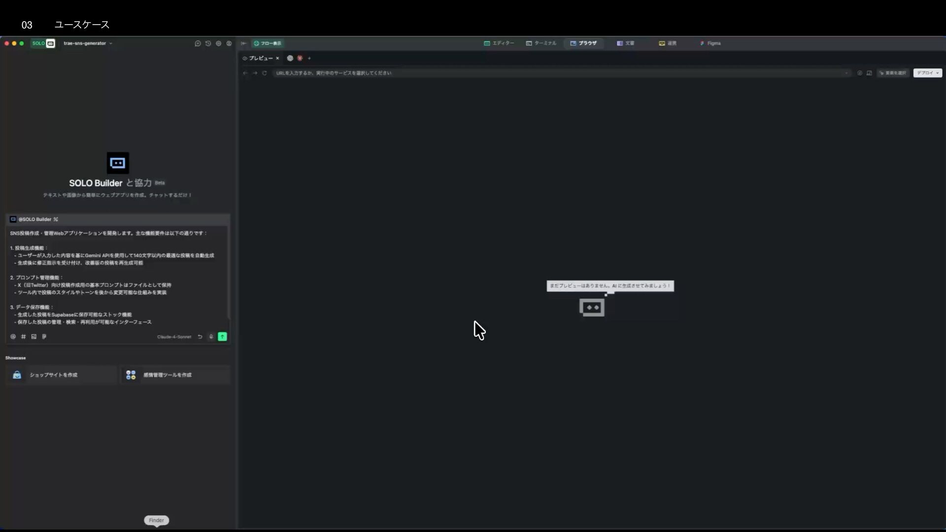 02 SOLOϞʔυ SOLEϞʔυ ཁ݅ཧղɺίʔυੜɺςετɺ݁ՌͷϓϨϏϡʔɺσϓϩΠϝϯτʹࢸΔ·Ͱ ։ൃϓϩηεશମΛAI͕ࣗతʹܭըɾ࣮ߦͰ͖Δɻ