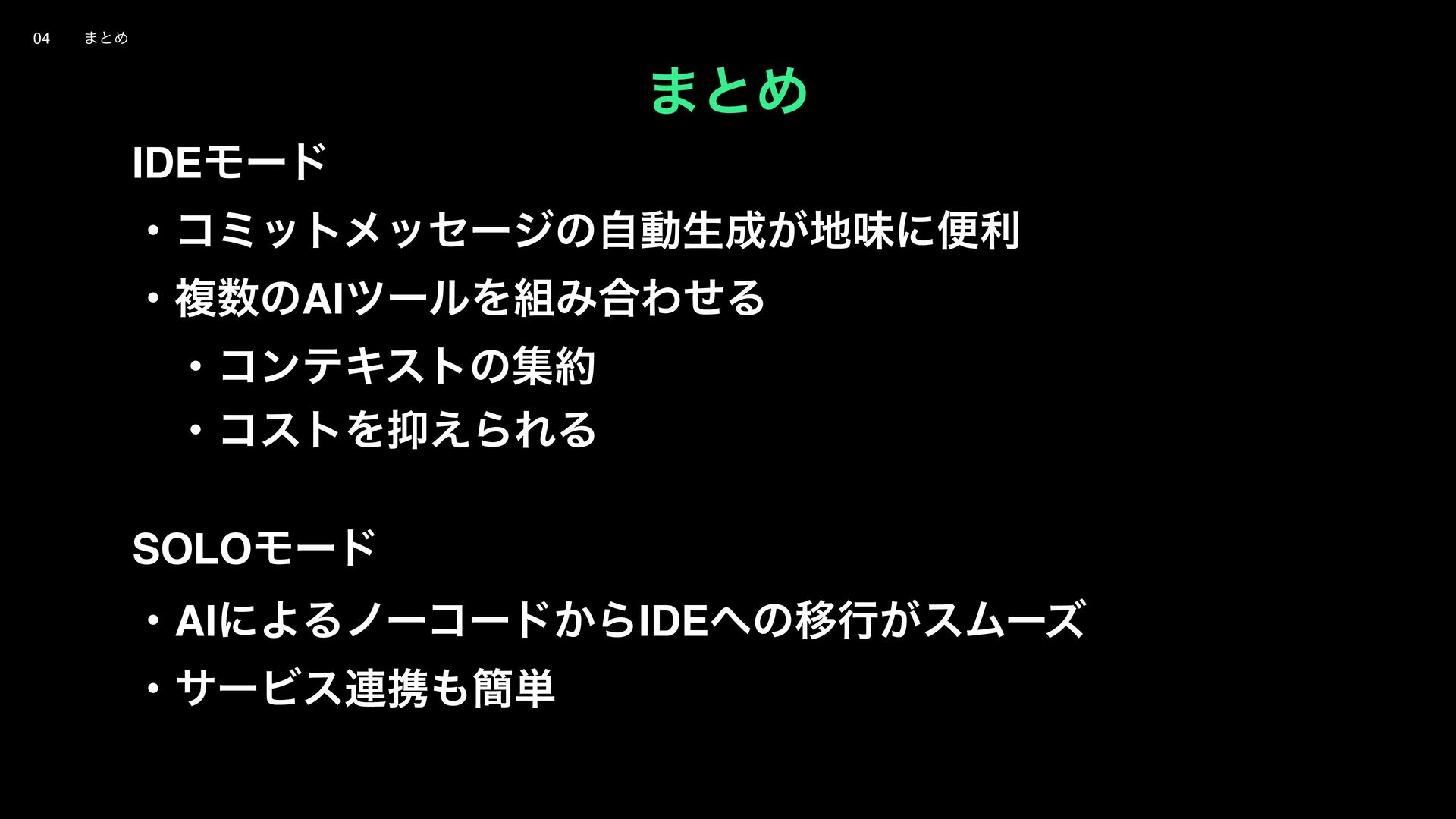 04 ·ͱΊ ·ͱΊ IDEϞʔυ ɾίϛοτϝοηʔδͷࣗಈੜ͕ຯʹศར ɾෳͷAIπʔϧΛΈ߹ΘͤΔ ɹɾίϯςΩετͷू ɹɾίετΛ͑ΒΕΔ SOLOϞʔυ ɾAIʹΑΔϊʔίʔυ͔ΒIDEͷҠߦ͕εϜʔζ