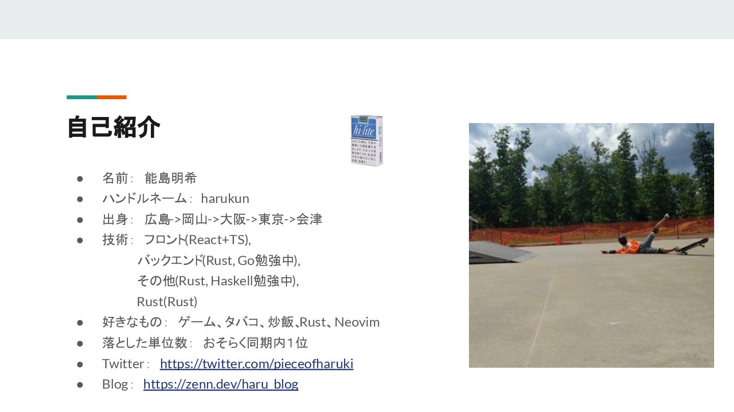 Go勉強中), その他(Rust, Haskell勉強中), Rust(Rust) • 好きなもの: ゲーム、タバコ、炒飯、 Rust、Neovim • 落とした単位数: おそらく同期内1位 • Twitter: https://twitter.com/pieceofharuki • Blog: https://zenn.dev/haru_blog