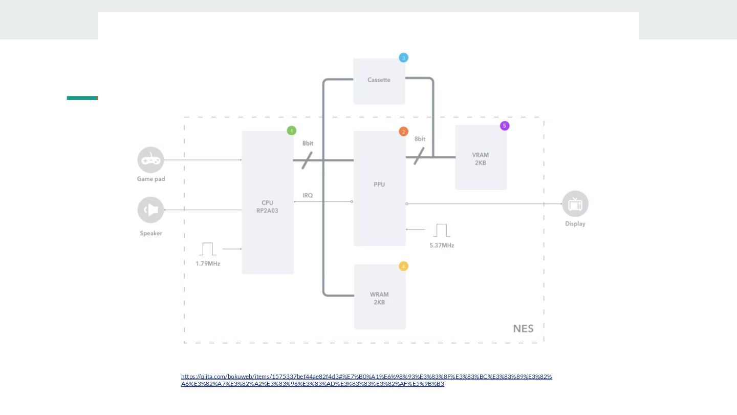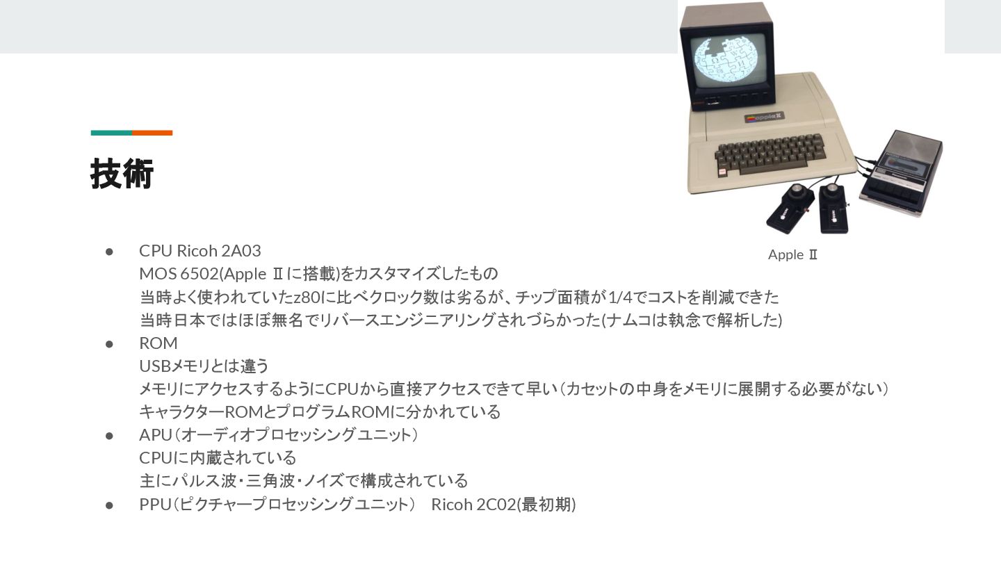 • ROM USBメモリとは違う メモリにアクセスするようにCPUから直接アクセスできて早い(カセットの中身をメモリに展開する必要がない) キャラクターROMとプログラムROMに分かれている • APU(オーディオプロセッシングユニット) CPUに内蔵されている 主にパルス波・三角波・ノイズで構成されている • PPU(ピクチャープロセッシングユニット) Ricoh 2C02(最初期) Apple Ⅱ