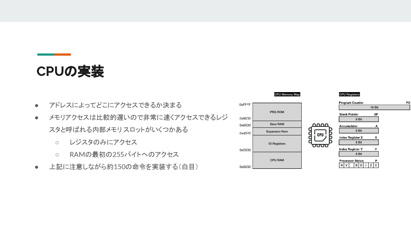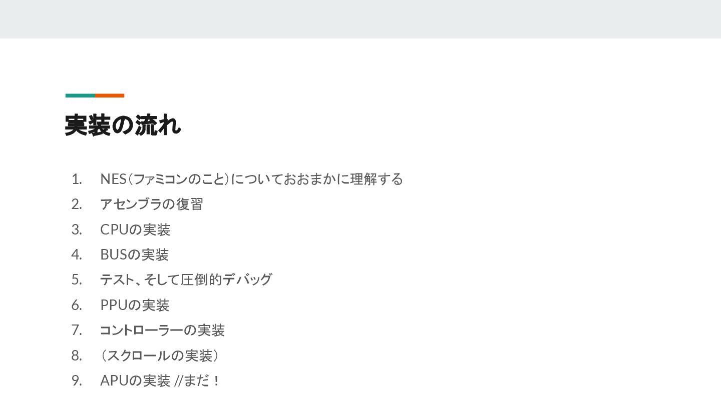 実装の流れ 1. NES(ファミコンのこと)についておおまかに理解する 2. アセンブラの復習 3. CPUの実装 4. BUSの実装 5.