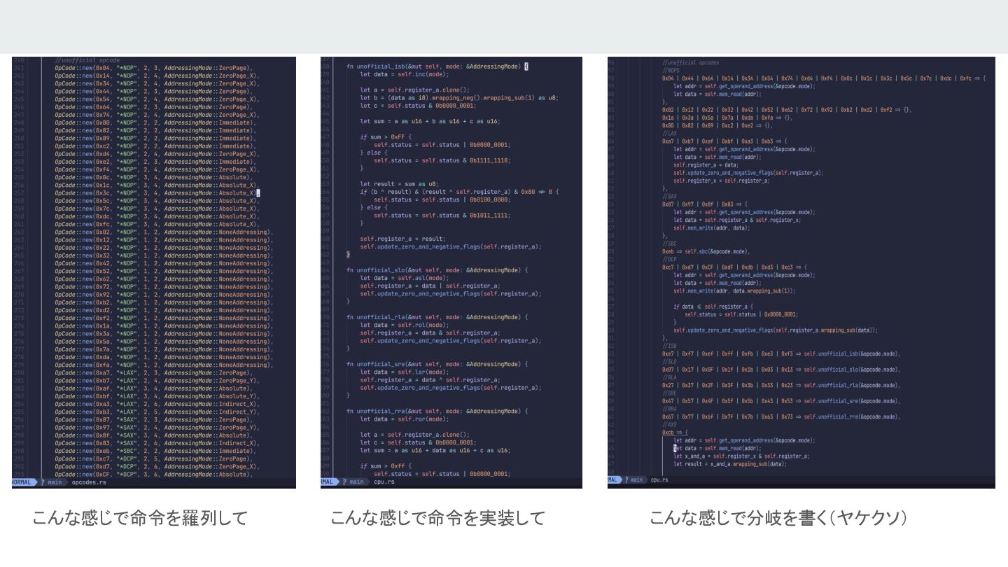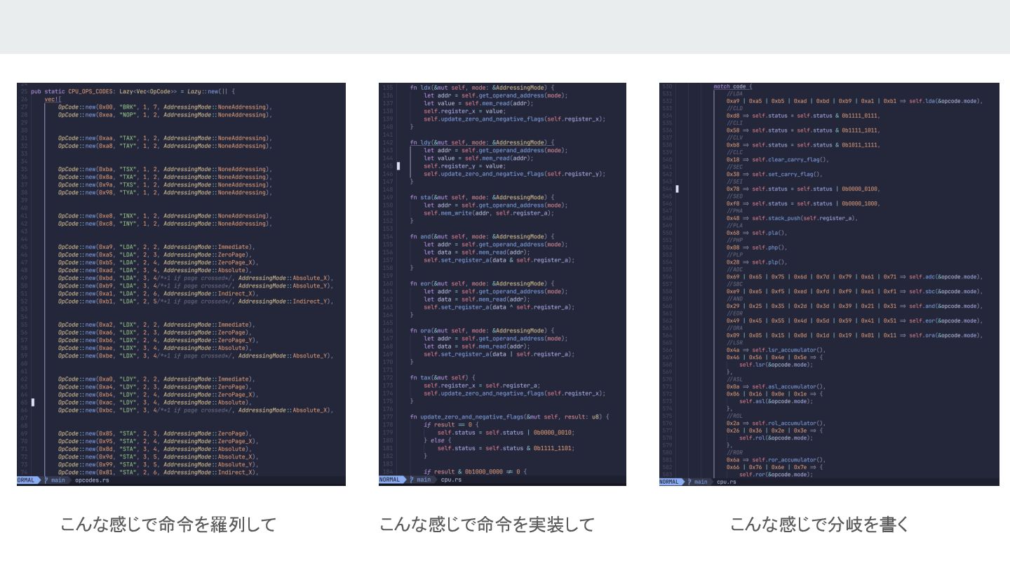 こんな感じで命令を羅列して こんな感じで命令を実装して こんな感じで分岐を書く