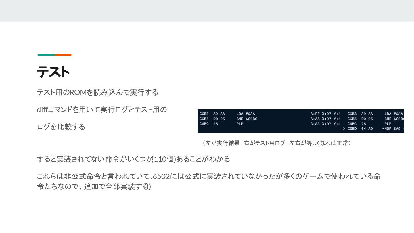 テスト テスト用のROMを読み込んで実行する diffコマンドを用いて実行ログとテスト用の ログを比較する (左が実行結果 右がテスト用ログ 左右が等しくなれば正常) すると実装されてない命令がいくつか (110個)あることがわかる これらは非公式命令と言われていて、 6502には公式に実装されていなかったが多くのゲームで使われている命 令たちなので、追加で全部実装する