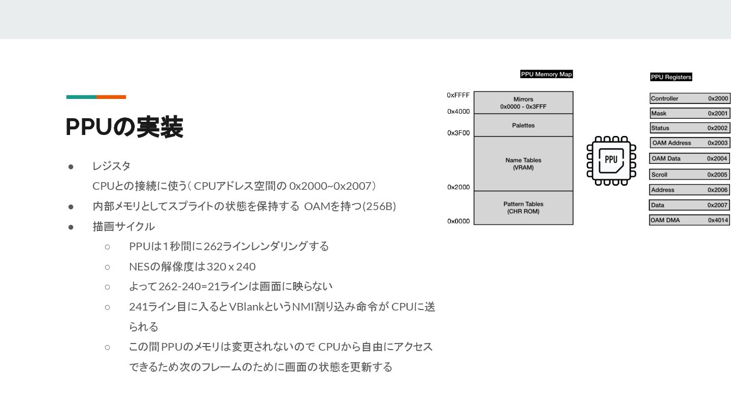 PPUの実装 • レジスタ CPUとの接続に使う( CPUアドレス空間の0x2000~0x2007) • 内部メモリとしてスプライトの状態を保持する OAMを持つ(256B) • 描画サイクル