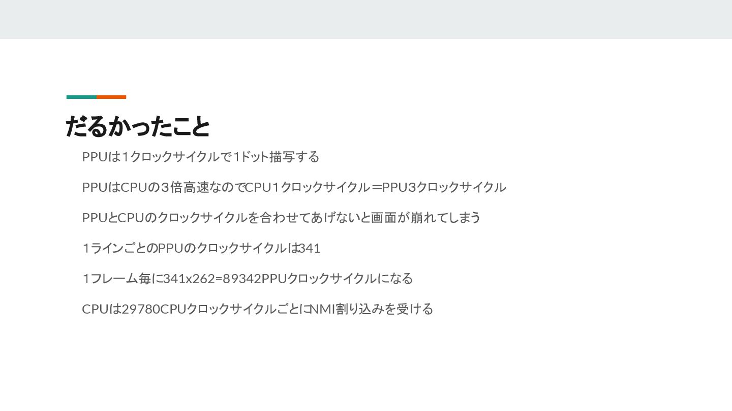 だるかったこと PPUは1クロックサイクルで1ドット描写する PPUはCPUの3倍高速なのでCPU1クロックサイクル=PPU3クロックサイクル PPUとCPUのクロックサイクルを合わせてあげないと画面が崩れてしまう 1ラインごとのPPUのクロックサイクルは341 1フレーム毎に341x262=89342PPUクロックサイクルになる CPUは29780CPUクロックサイクルごとにNMI割り込みを受ける