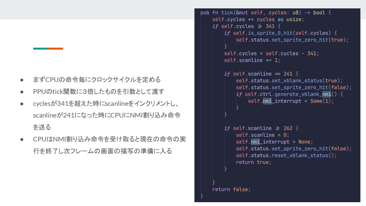 • まずCPUの命令毎にクロックサイクルを定める • PPUのtick関数に3倍したものを引数として渡す • cyclesが341を超えた時にscanlineをインクリメントし、 scanlineが241になった時にCPUにNMI割り込み命令 を送る • CPUはNMI割り込み命令を受け取ると現在の命令の実