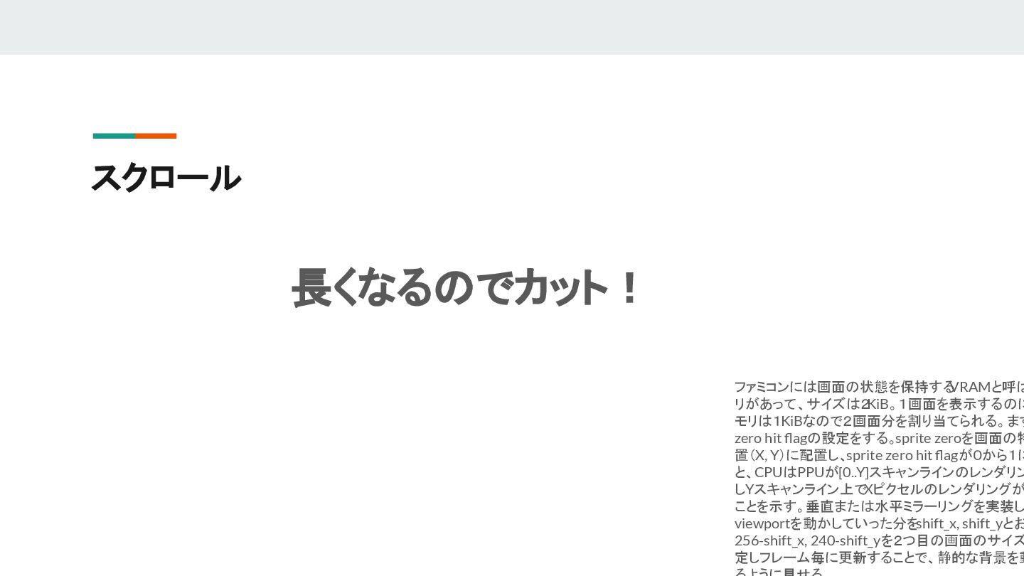 スクロール 長くなるのでカット! ファミコンには画面の状態を保持する VRAMと呼ば リがあって、サイズは2 KiB。1画面を表示するのに モリは1KiBなので2画面分を割り当てられる。まず zero hit flagの設定をする。sprite