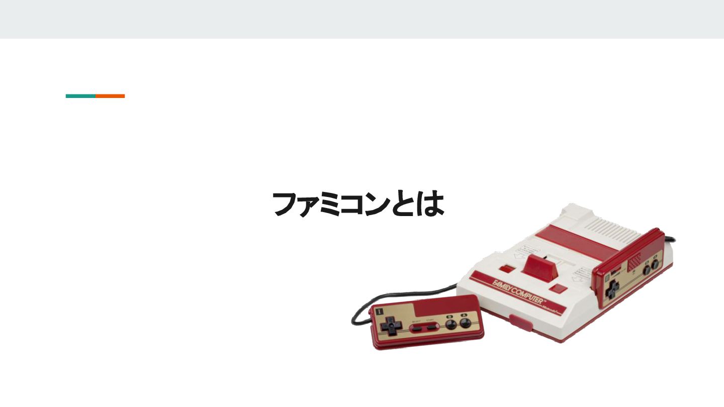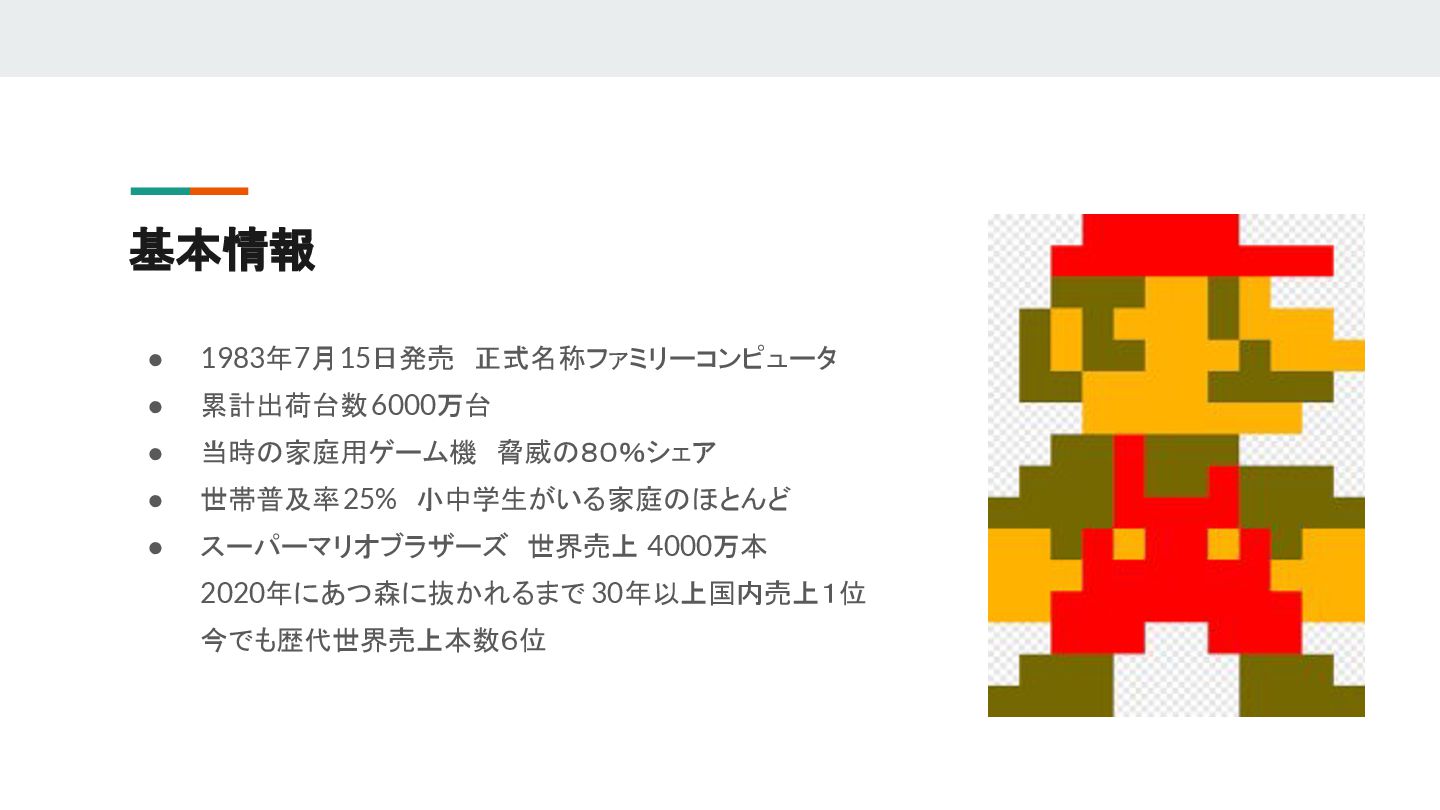 基本情報 • 1983年7月15日発売 正式名称ファミリーコンピュータ • 累計出荷台数6000万台 • 当時の家庭用ゲーム機 脅威の80%シェア • 世帯普及率25% 小中学生がいる家庭のほとんど •