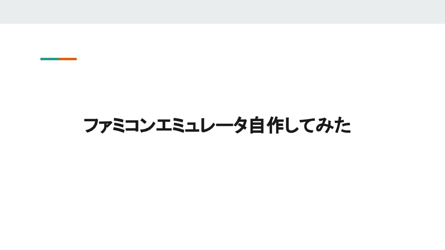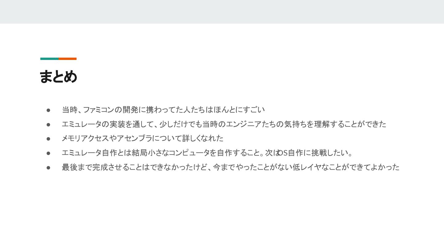 まとめ • 当時、ファミコンの開発に携わってた人たちはほんとにすごい • エミュレータの実装を通して、少しだけでも当時のエンジニアたちの気持ちを理解することができた • メモリアクセスやアセンブラについて詳しくなれた • エミュレータ自作とは結局小さなコンピュータを自作すること。次は OS自作に挑戦したい。
