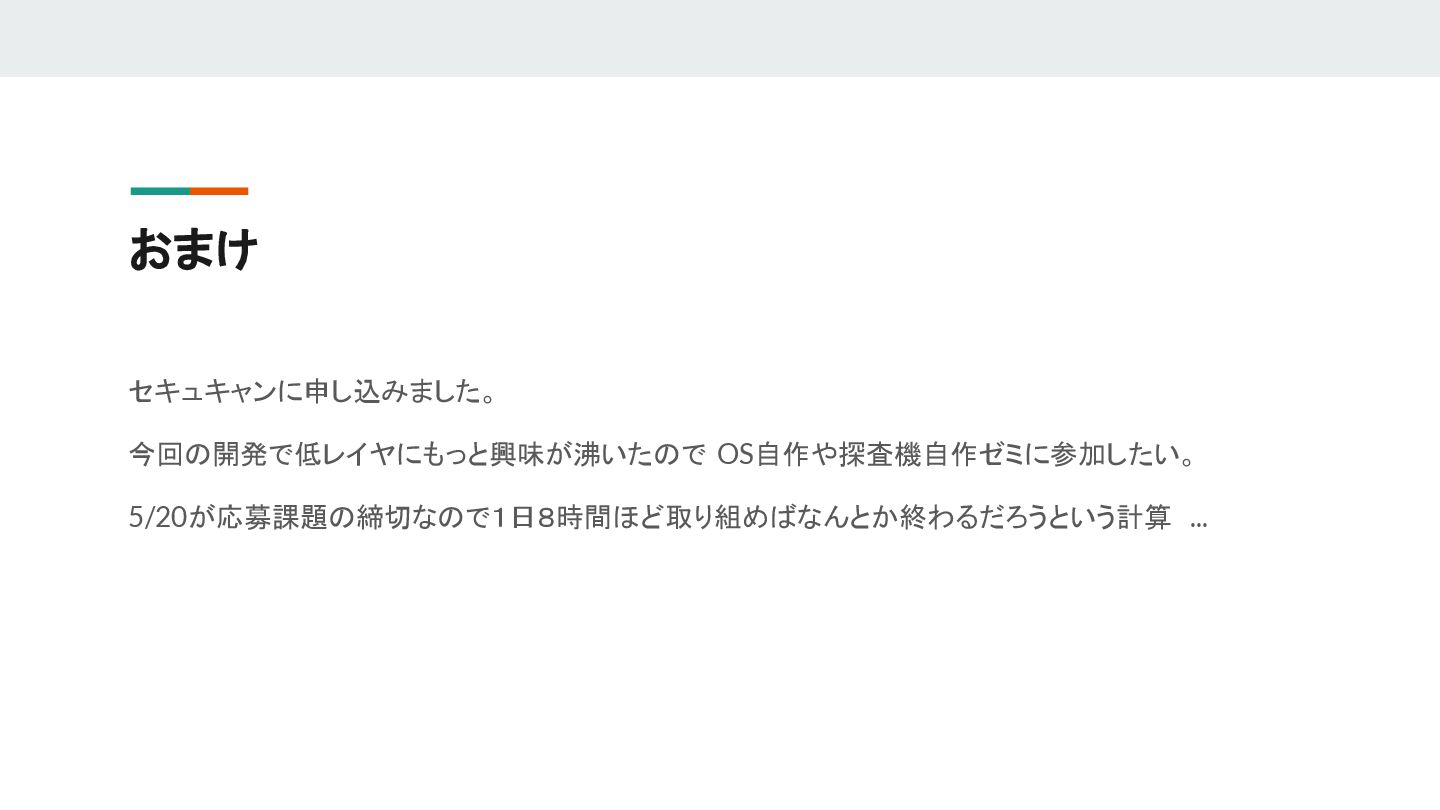 おまけ セキュキャンに申し込みました。 今回の開発で低レイヤにもっと興味が沸いたので OS自作や探査機自作ゼミに参加したい。 5/20が応募課題の締切なので1日8時間ほど取り組めばなんとか終わるだろうという計算 ...