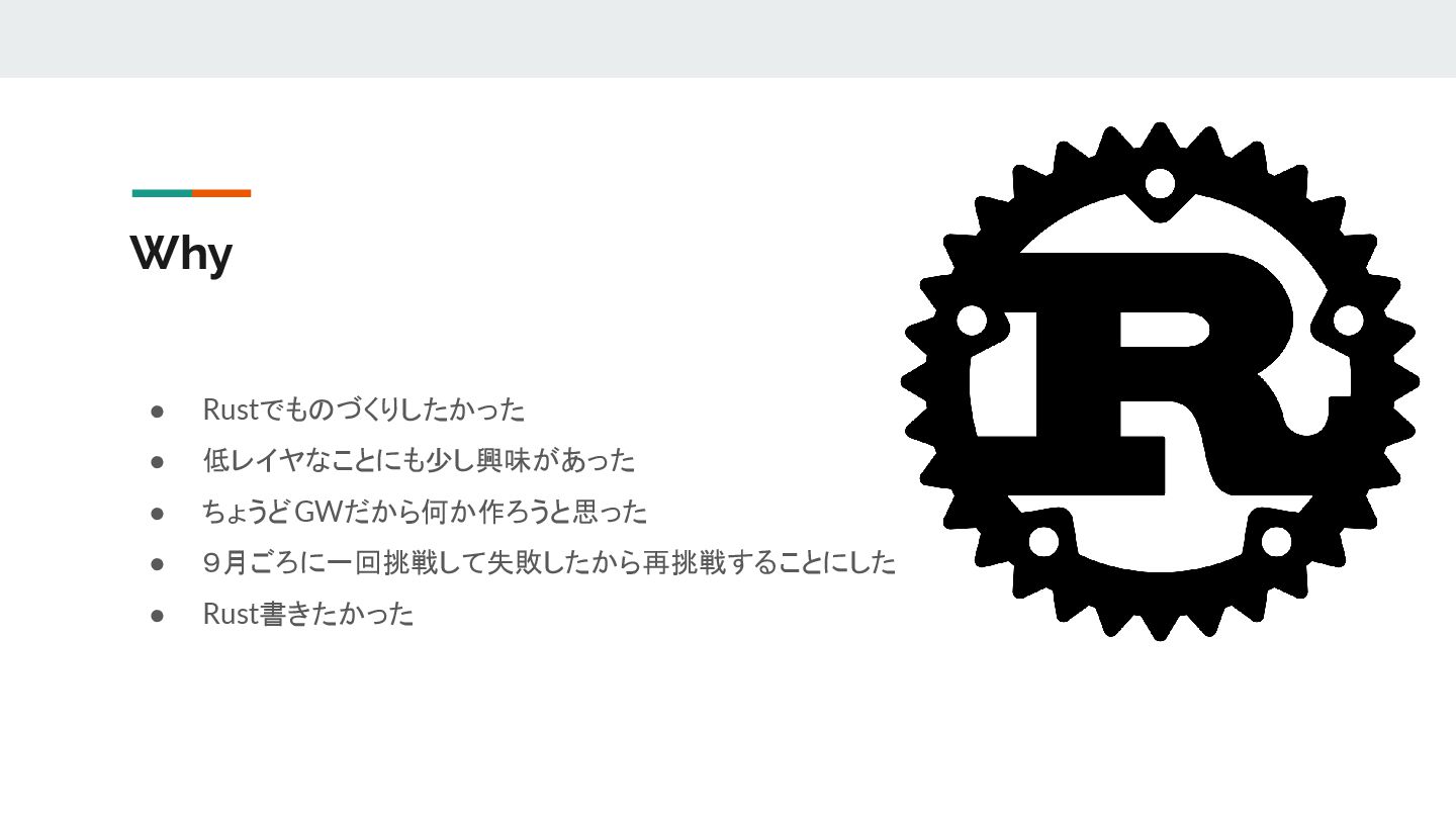 Why • Rustでものづくりしたかった • 低レイヤなことにも少し興味があった • ちょうどGWだから何か作ろうと思った • 9月ごろに一回挑戦して失敗したから再挑戦することにした •