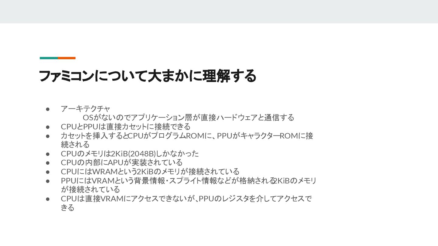 ファミコンについて大まかに理解する • アーキテクチャ OSがないのでアプリケーション層が直接ハードウェアと通信する • CPUとPPUは直接カセットに接続できる • カセットを挿入するとCPUがプログラムROMに、PPUがキャラクターROMに接 続される •