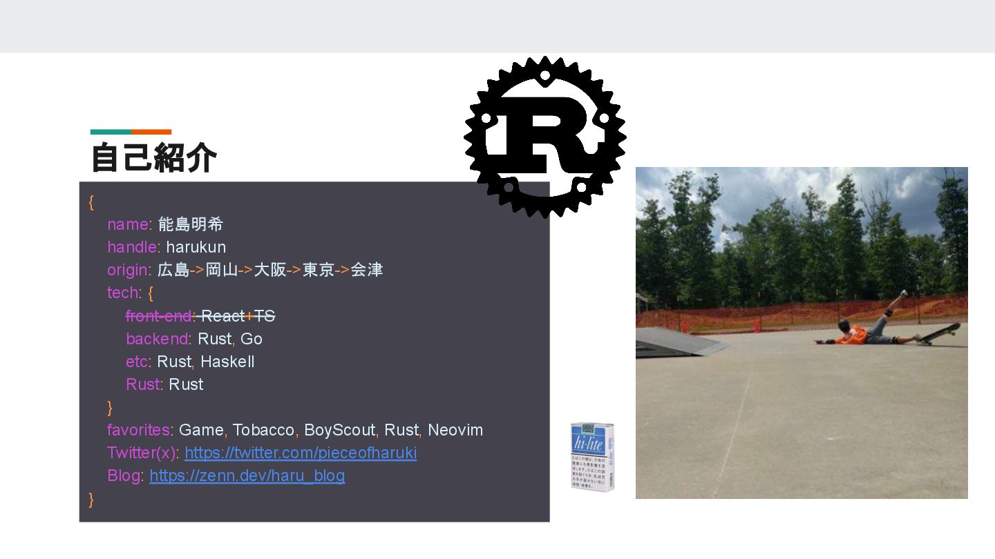 front-end: React+TS backend: Rust, Go etc: Rust, Haskell Rust: Rust } favorites: Game, Tobacco, BoyScout, Rust, Neovim Twitter(x): https://twitter.com/pieceofharuki Blog: https://zenn.dev/haru_blog }