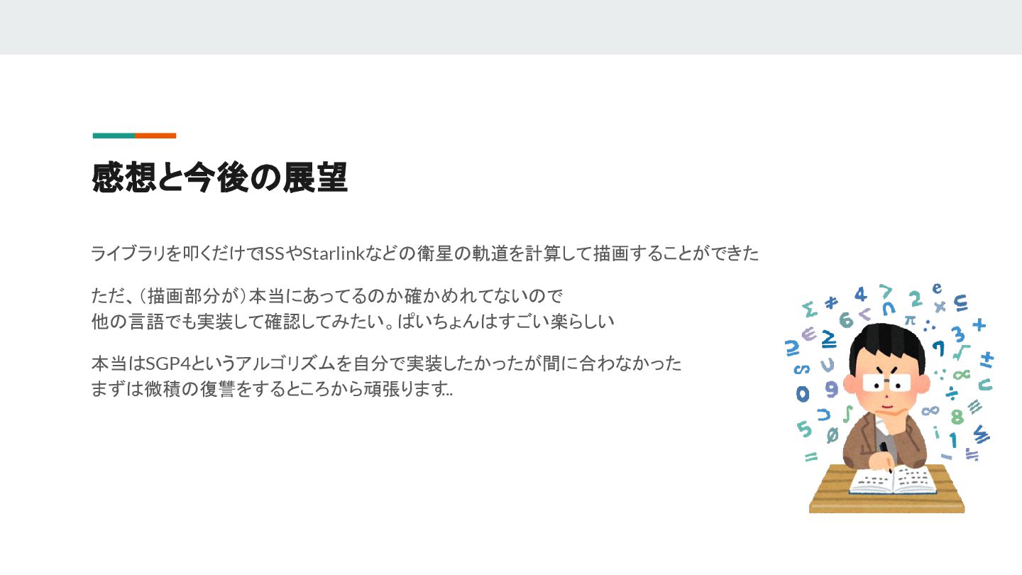 感想と今後の展望 ライブラリを叩くだけでISSやStarlinkなどの衛星の軌道を計算して描画することができた ただ、(描画部分が)本当にあってるのか確かめれてないので 他の言語でも実装して確認してみたい。ぱいちょんはすごい楽らしい 本当はSGP4というアルゴリズムを自分で実装したかったが間に合わなかった まずは微積の復讐をするところから頑張ります ...