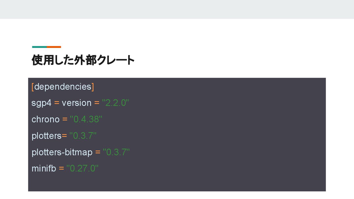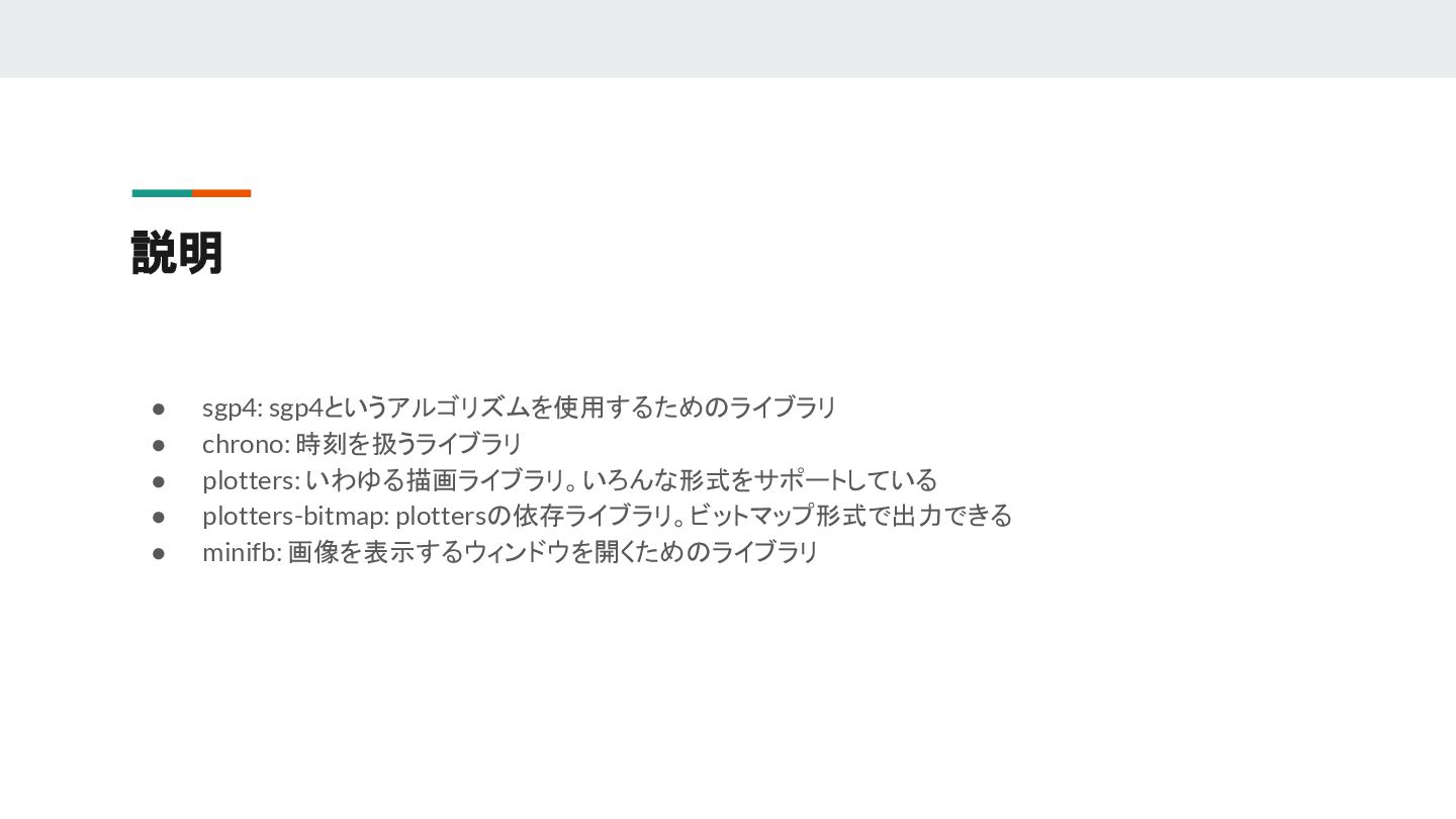 • sgp4: sgp4というアルゴリズムを使用するためのライブラリ • chrono: 時刻を扱うライブラリ • plotters: いわゆる描画ライブラリ。いろんな形式をサポートしている •