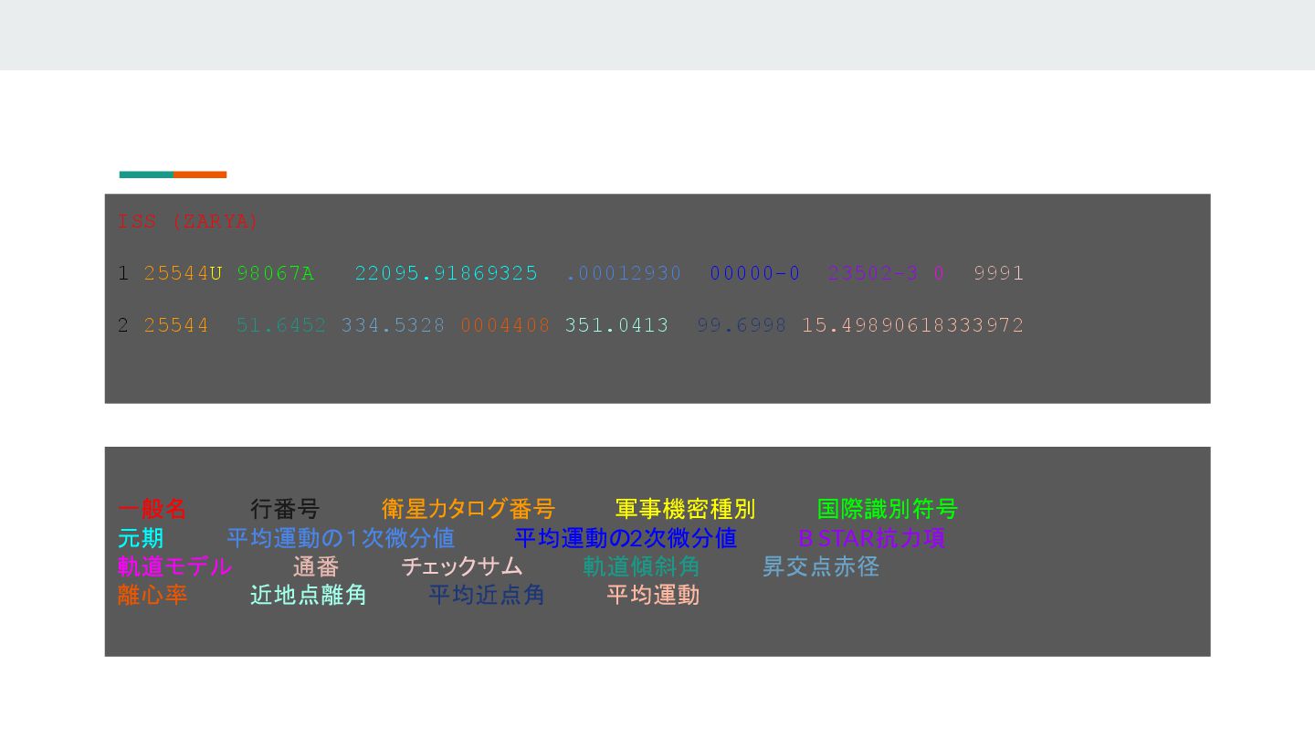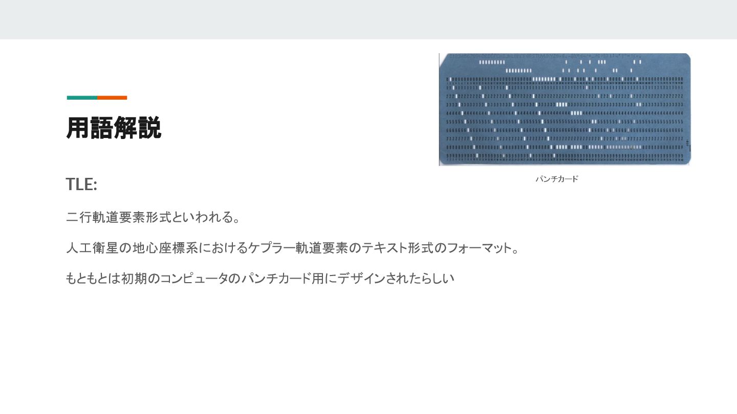 用語解説 TLE: 二行軌道要素形式といわれる。 人工衛星の地心座標系におけるケプラー軌道要素のテキスト形式のフォーマット。 もともとは初期のコンピュータのパンチカード用にデザインされたらしい パンチカード