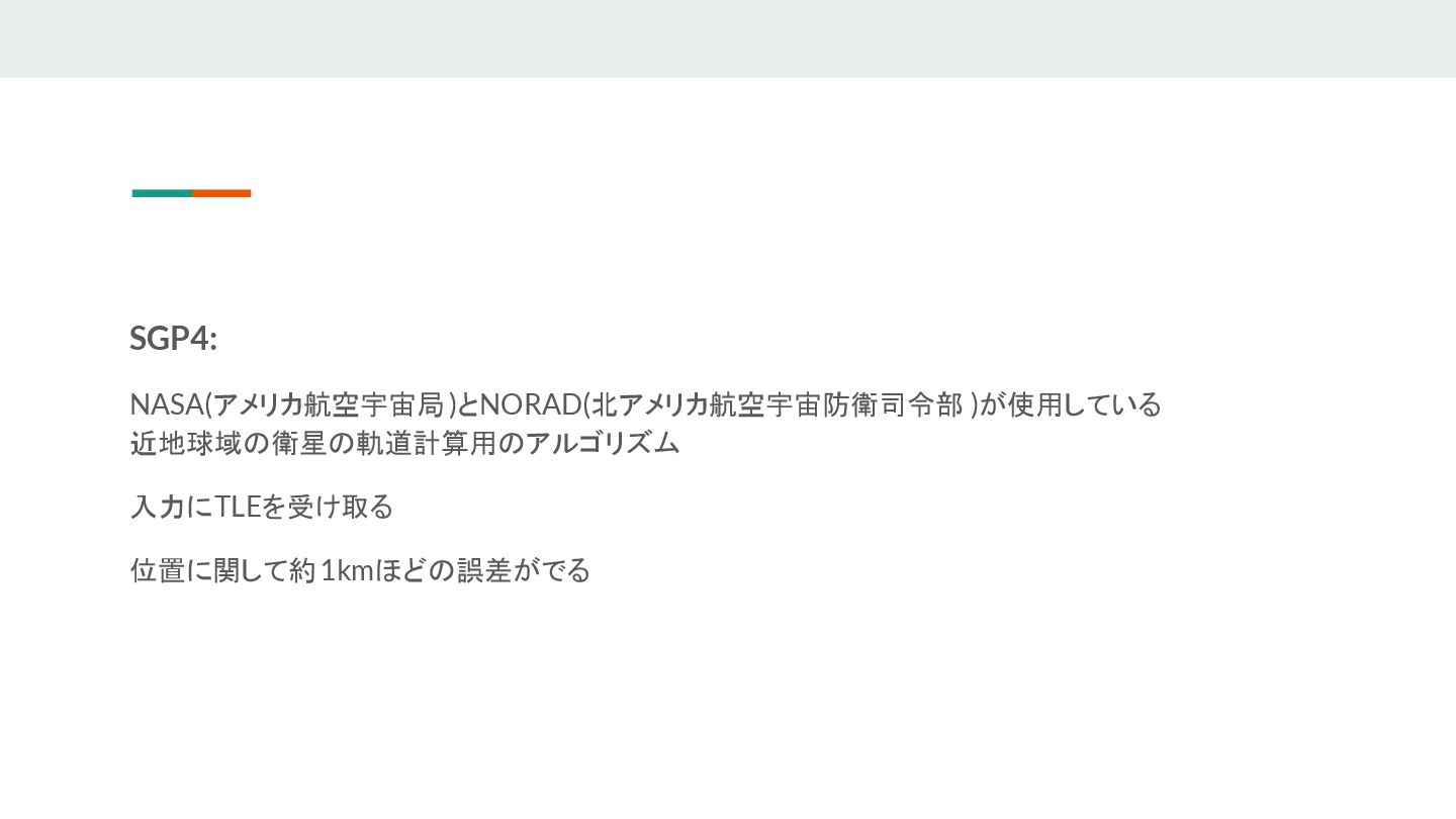 SGP4: NASA(アメリカ航空宇宙局)とNORAD(北アメリカ航空宇宙防衛司令部 )が使用している 近地球域の衛星の軌道計算用のアルゴリズム 入力にTLEを受け取る 位置に関して約1kmほどの誤差がでる