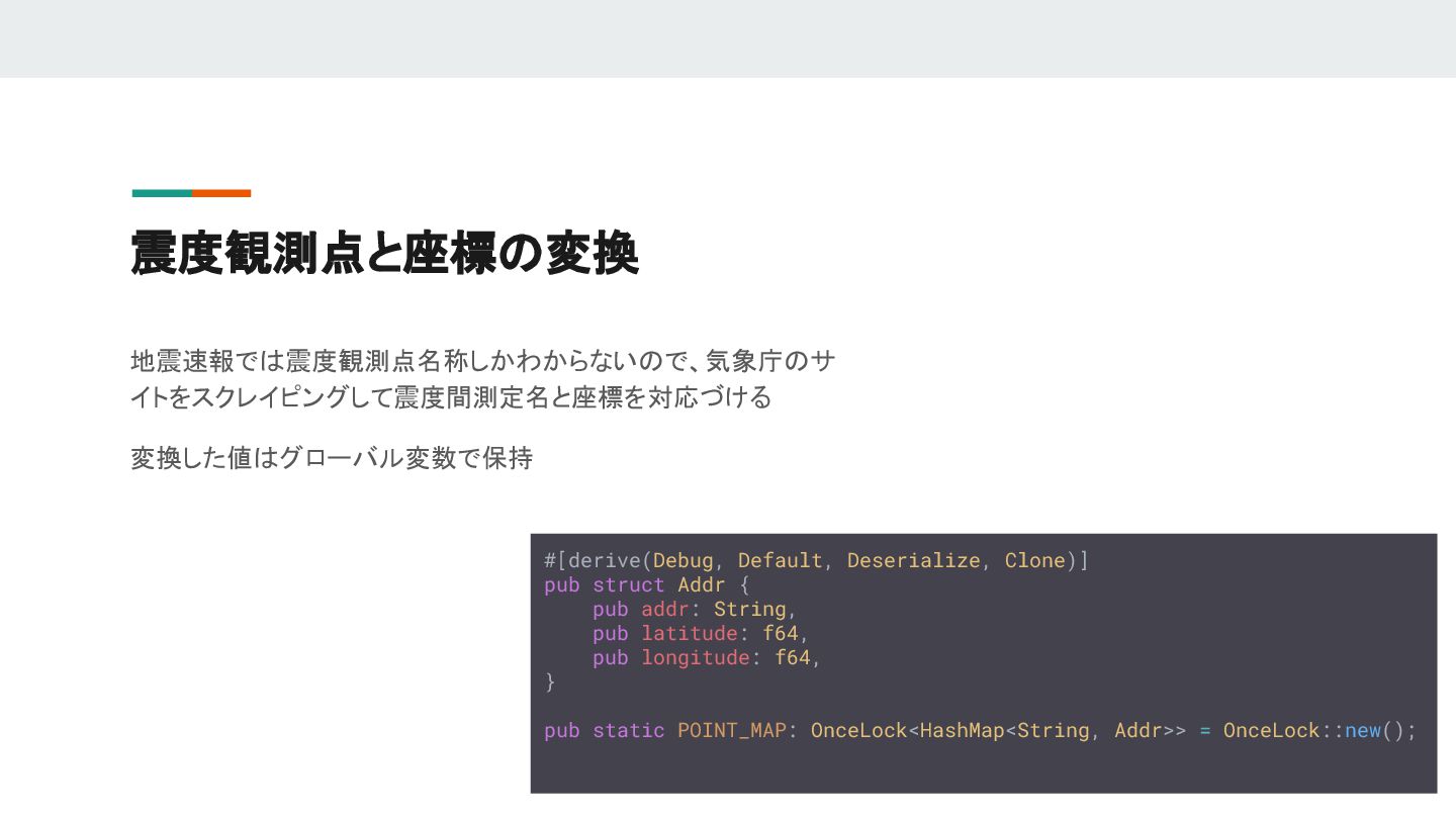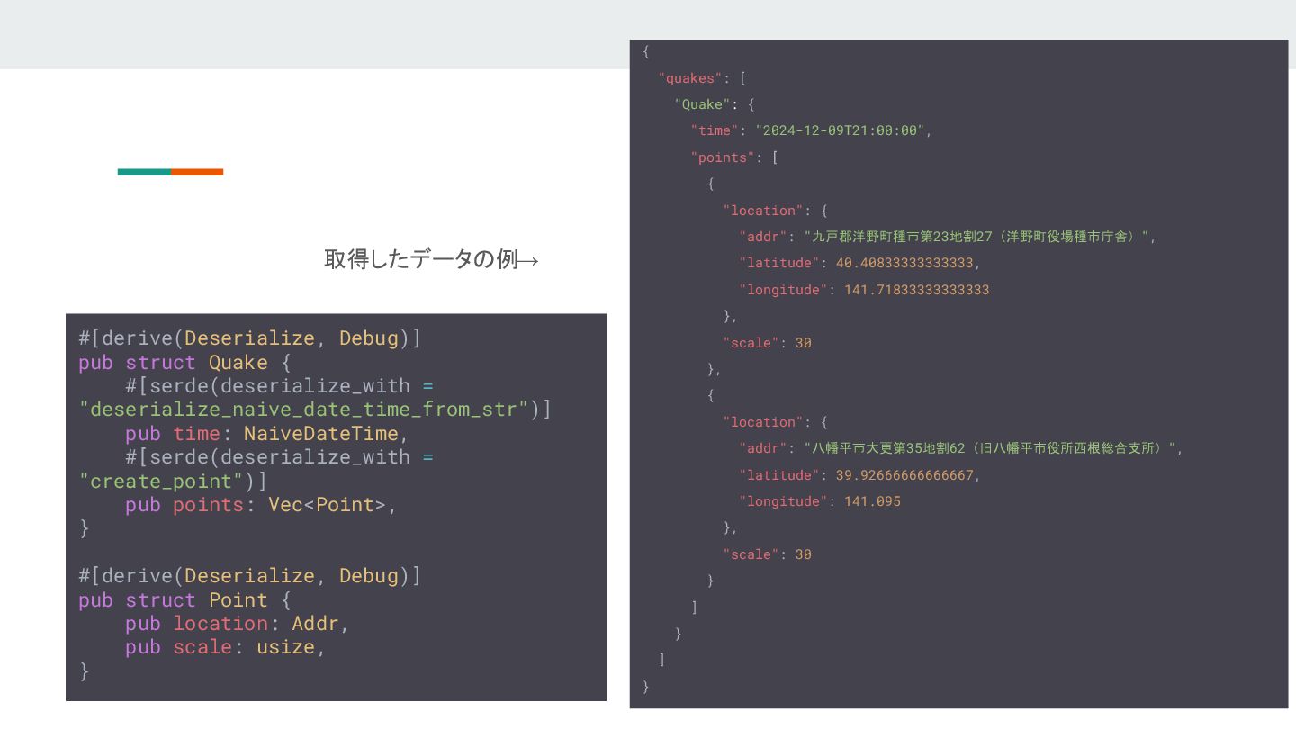 "location": { "addr": "九戸郡洋野町種市第23地割27(洋野町役場種市庁舎)", "latitude": 40.40833333333333, "longitude": 141.71833333333333 }, "scale": 30 }, { "location": { "addr": "八幡平市大更第35地割62(旧八幡平市役所西根総合支所)", "latitude": 39.92666666666667, "longitude": 141.095 }, "scale": 30 } ] } ] } #[derive(Deserialize, Debug)] pub struct Quake { #[serde(deserialize_with = "deserialize_naive_date_time_from_str")] pub time: NaiveDateTime, #[serde(deserialize_with = "create_point")] pub points: Vec<Point>, } #[derive(Deserialize, Debug)] pub struct Point { pub location: Addr, pub scale: usize, } 取得したデータの例→