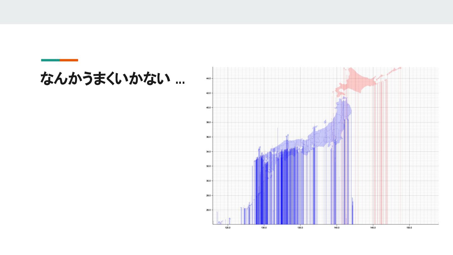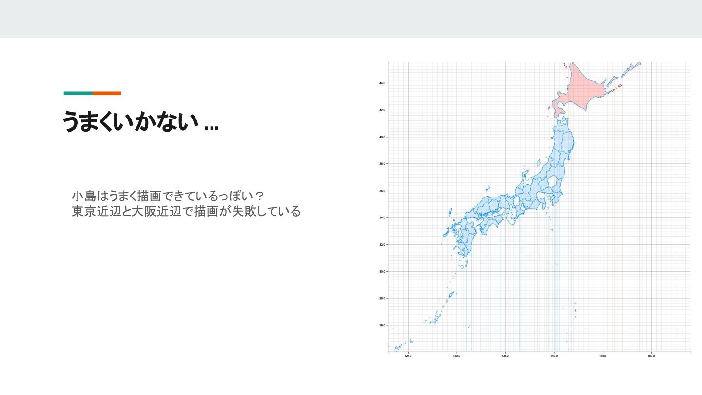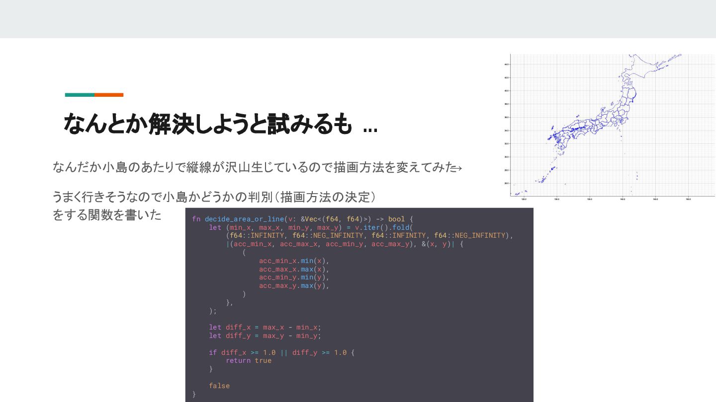6. なんとか解決しようと試みるも ... なんだか小島のあたりで縦線が沢山生じているので描画方法を変えてみた → うまく行きそうなので小島かどうかの判別(描画方法の決定) をする関数を書いた fn decide_area_or_line(v: &Vec<(f64, f64)>)