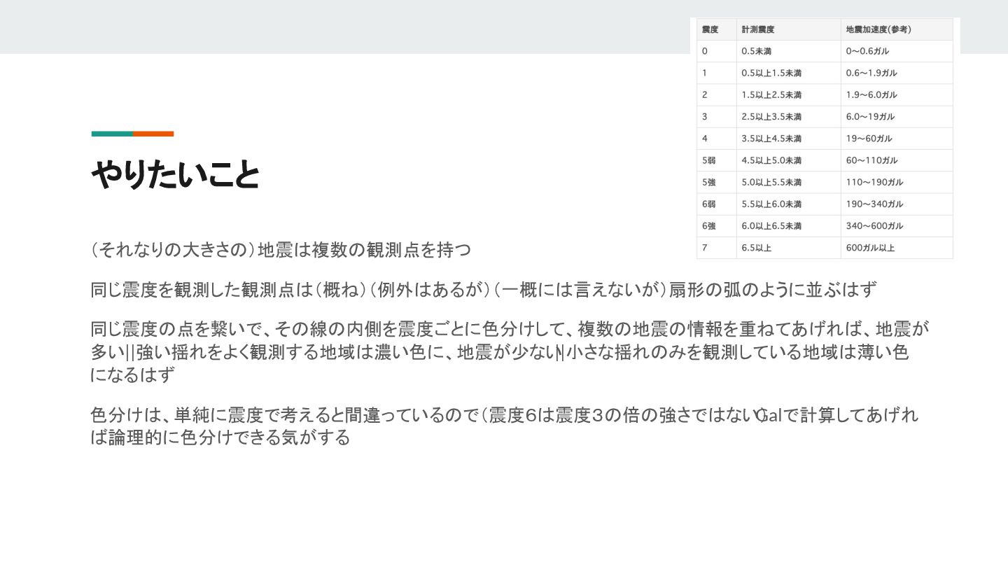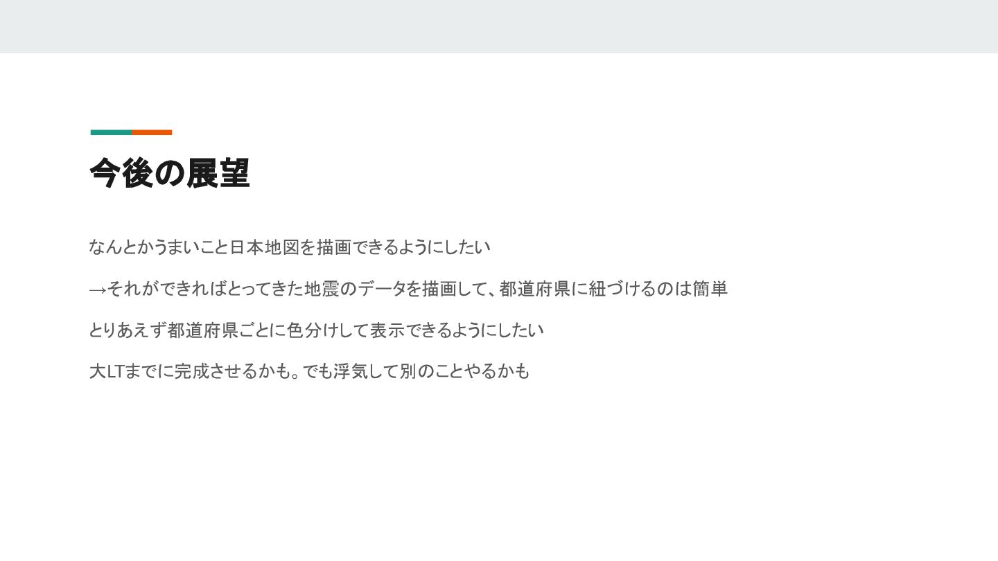 { create_point_list().await?; let url = "https://api.p2pquake.net/v2/jma/quake"; let params = [ ("limit", "100"), ("order", "-1"), ("quake_type", "ScalePrompt"), ("min_scale", "20"), ]; let client = reqwest::Client::new(); let response = client .get(url) .query(&params) .header("accept", "application/json") .send() .await?; let json: serde_json::Value = response.json().await?; let quakes = parse_json(json)?; Ok(()) } apiを叩いて、とってきたJsonをstructに変換する