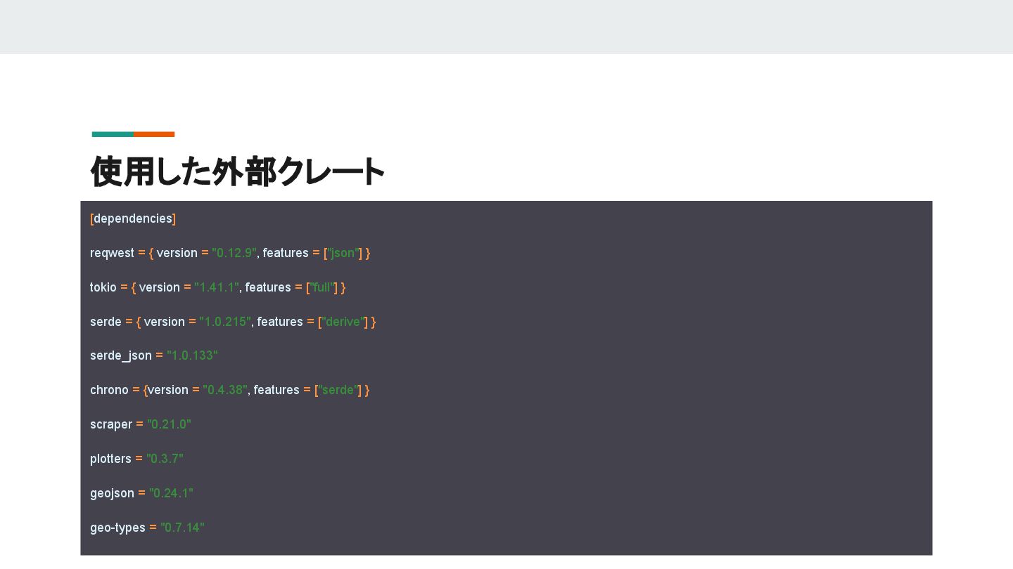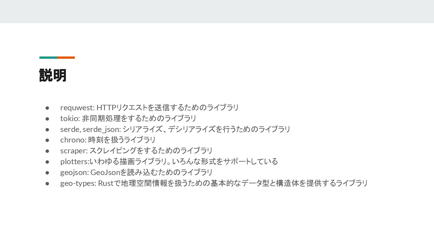 シリアライズ、デシリアライズを行うためのライブラリ • chrono: 時刻を扱うライブラリ • scraper: スクレイピングをするためのライブラリ • plotters:いわゆる描画ライブラリ。いろんな形式をサポートしている • geojson: GeoJsonを読み込むためのライブラリ • geo-types: Rustで地理空間情報を扱うための基本的なデータ型と構造体を提供するライブラリ