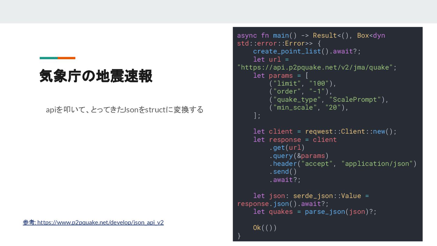 4. 気象庁の地震速報 参考: https://www.p2pquake.net/develop/json_api_v2 async fn main() -> Result<(), Box<dyn std::error::Error>>