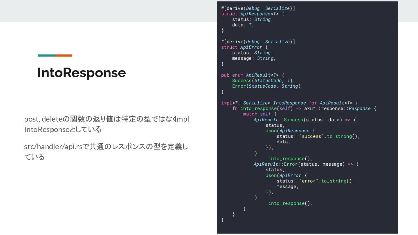 ApiResponse<T> { status: String, data: T, } #[derive(Debug, Serialize)] struct ApiError { status: String, message: String, } pub enum ApiResult<T> { Success(StatusCode, T), Error(StatusCode, String), } impl<T: Serialize> IntoResponse for ApiResult<T> { fn into_response(self) -> axum::response::Response { match self { ApiResult::Success(status, data) => ( status, Json(ApiResponse { status: "success".to_string(), data, }), ) .into_response(), ApiResult::Error(status, message) => ( status, Json(ApiError { status: "error".to_string(), message, }), ) .into_response(), } } }