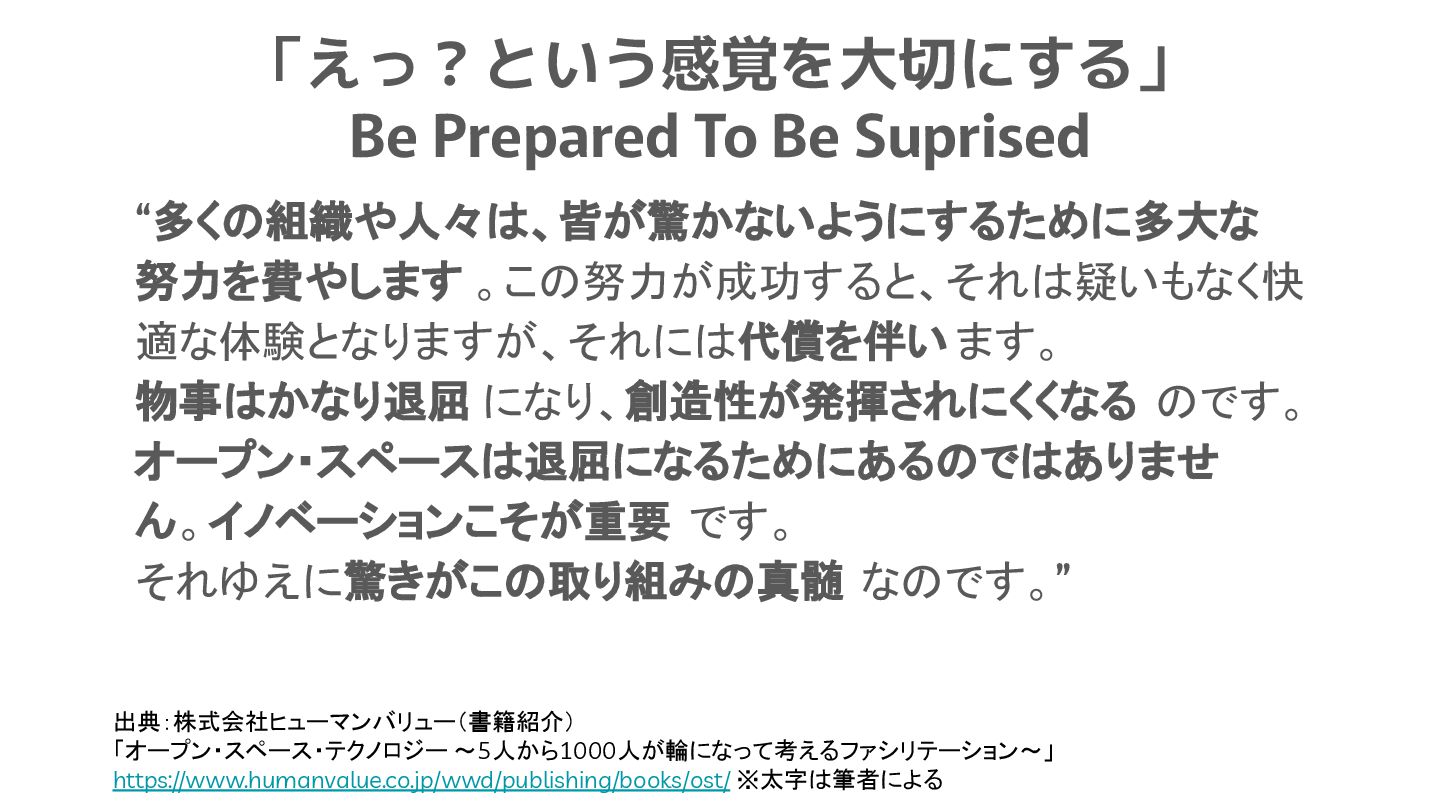 です。 それゆえに驚きがこの取り組みの真髄 なのです。” 出典:株式会社ヒューマンバリュー(書籍紹介) 「オープン・スペース・テクノロジー ~5人から1000人が輪になって考えるファシリテーション~」 https://www.humanvalue.co.jp/wwd/publishing/books/ost/ ※太字は筆者による 「えっ?という感覚を大切にする」 Be Prepared To Be Suprised