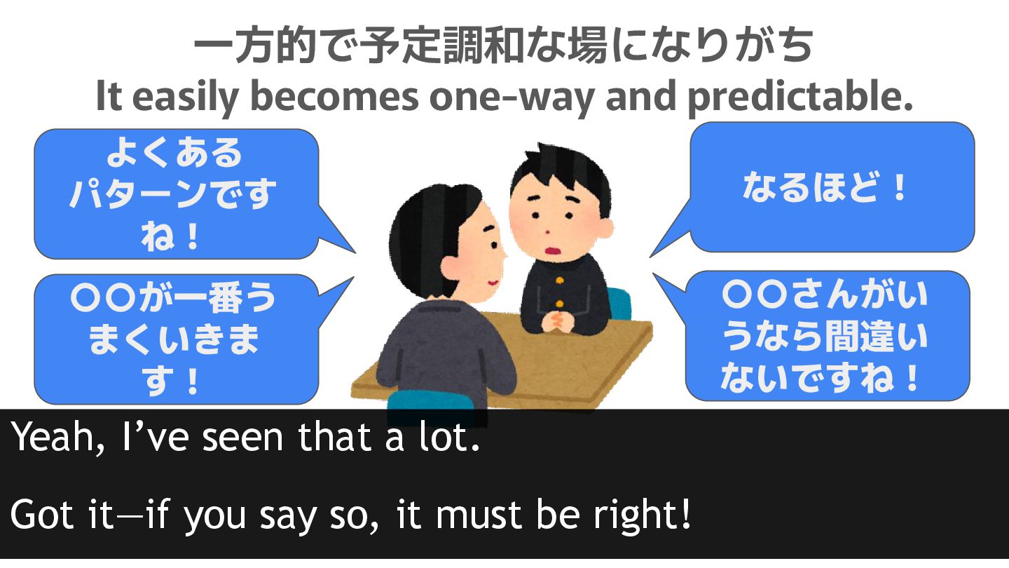 3. 一方的で予定調和な場になりがち It easily becomes one-way and predictable. よくある パターンです ね!
