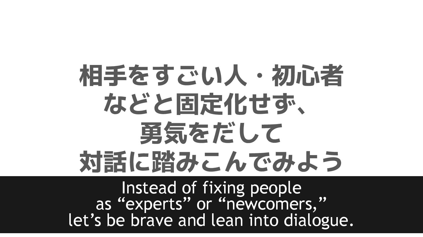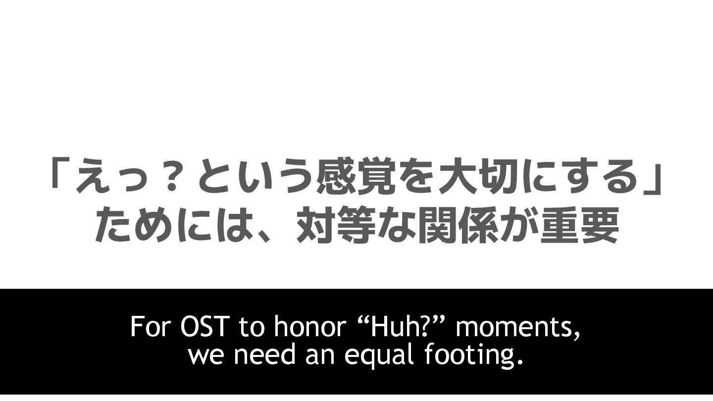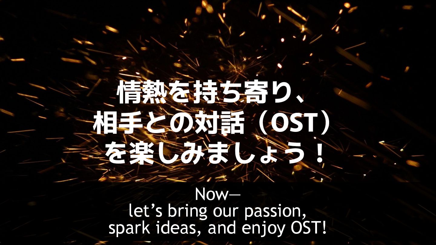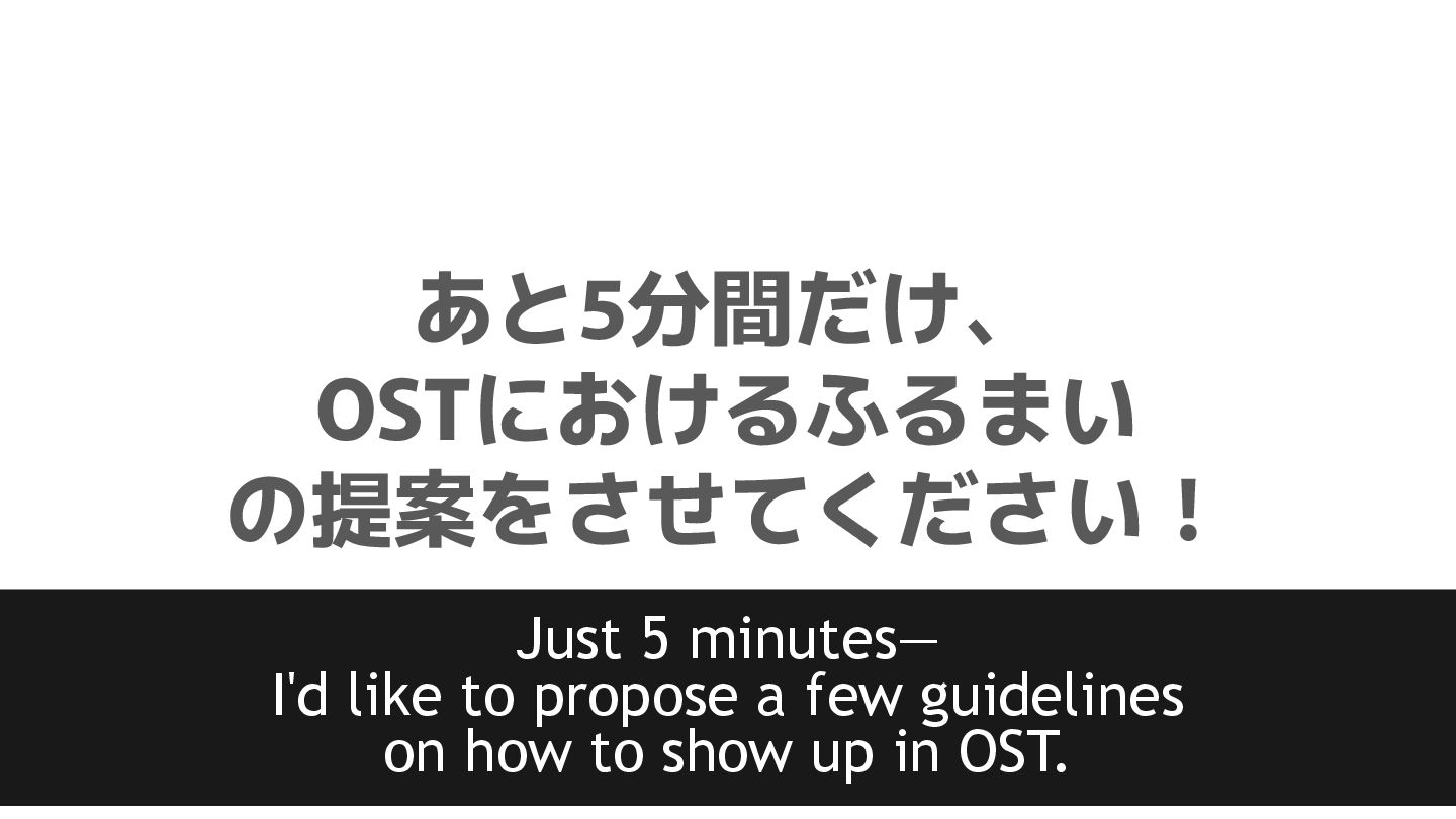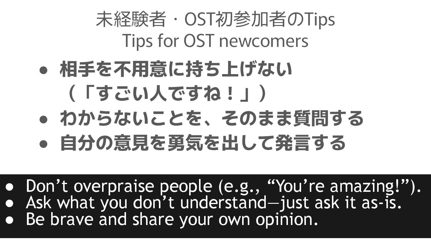 OST newcomers • Don’t overpraise people (e.g., “You’re amazing!”). • Ask what you don’t understand—just ask it as-is. • Be brave and share your own opinion.