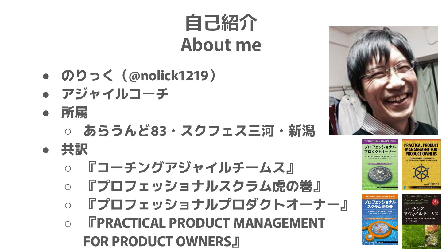 1. 自己紹介 About me • のりっく(@nolick1219) • アジャイルコーチ • 所属 ◦