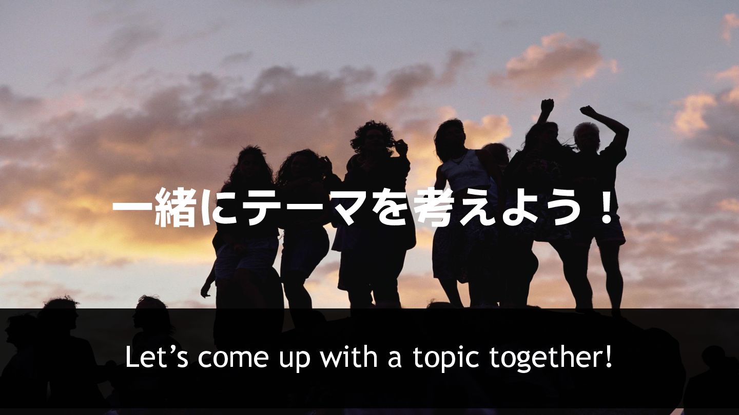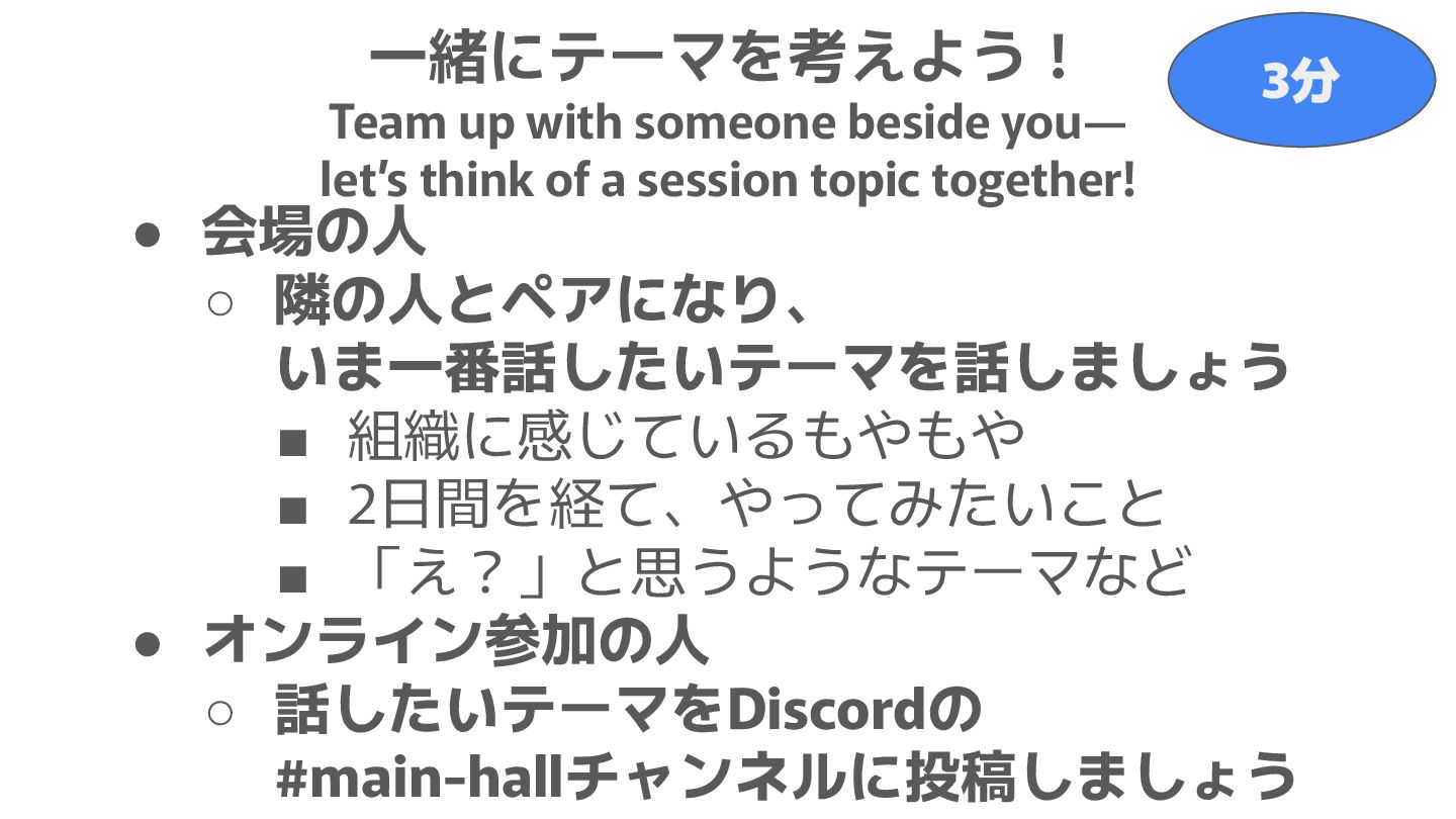 「え?」と思うようなテーマなど • オンライン参加の人 ◦ 話したいテーマをDiscordの #main-hallチャンネルに投稿しましょう 一緒にテーマを考えよう! Team up with someone beside you— let’s think of a session topic together! 3分