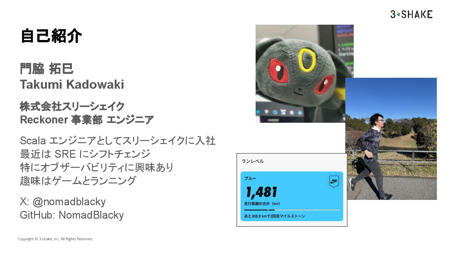 エンジニアとしてスリーシェイクに入社 最近は SRE にシフトチェンジ 特にオブザーバビリティに興味あり 趣味はゲームとランニング X: @nomadblacky GitHub: NomadBlacky Copyright © 3-shake, Inc. All Rights Reserved.