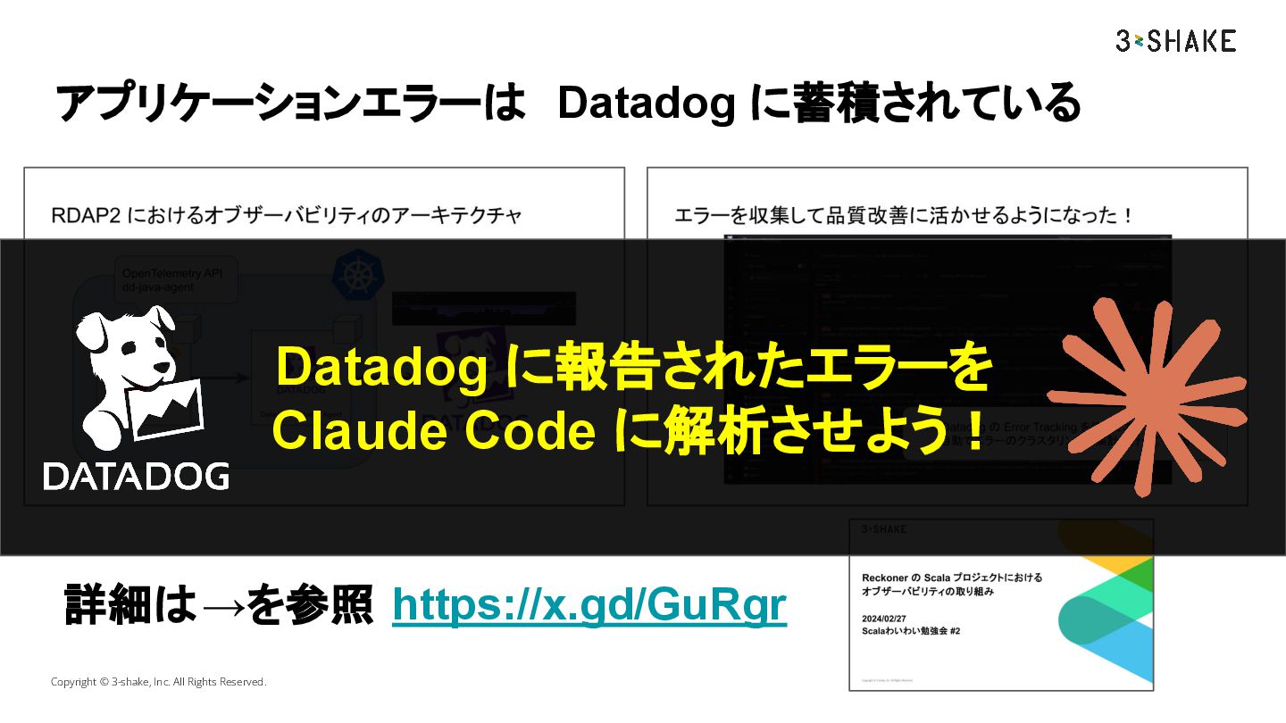 詳細は→を参照 https://x.gd/GuRgr Datadog に報告されたエラーを Claude Code に解析させよう!