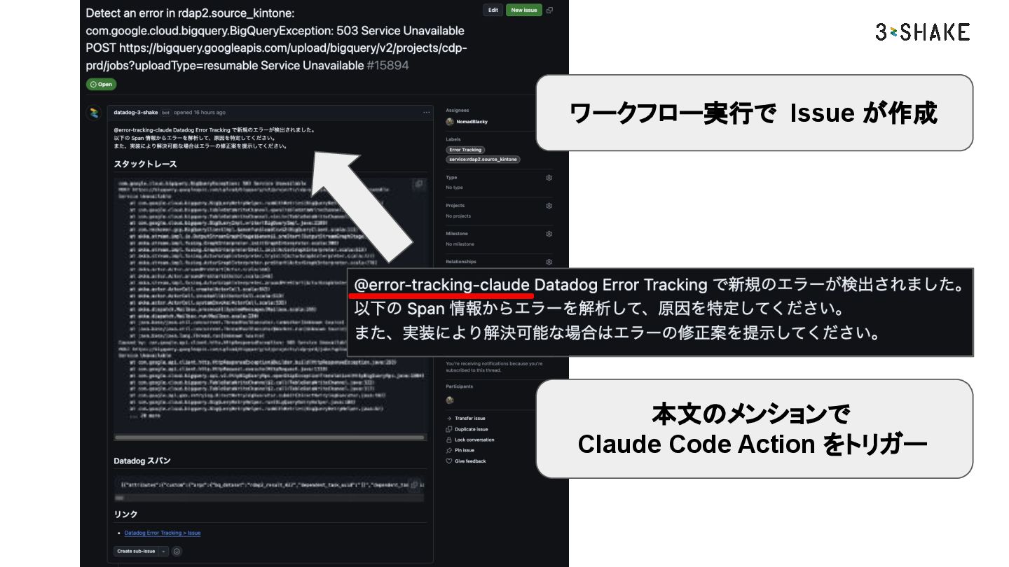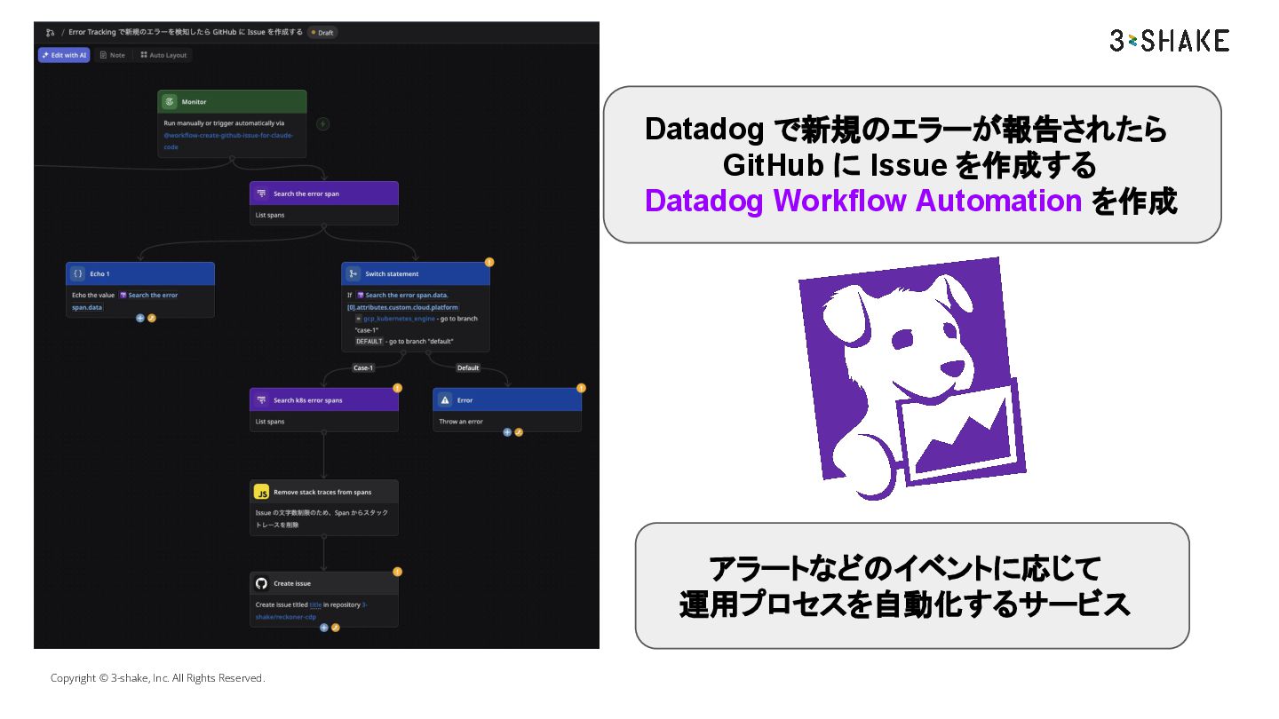 Copyright © 3-shake, Inc. All Rights Reserved. Datadog で新規のエラーが報告されたら GitHub