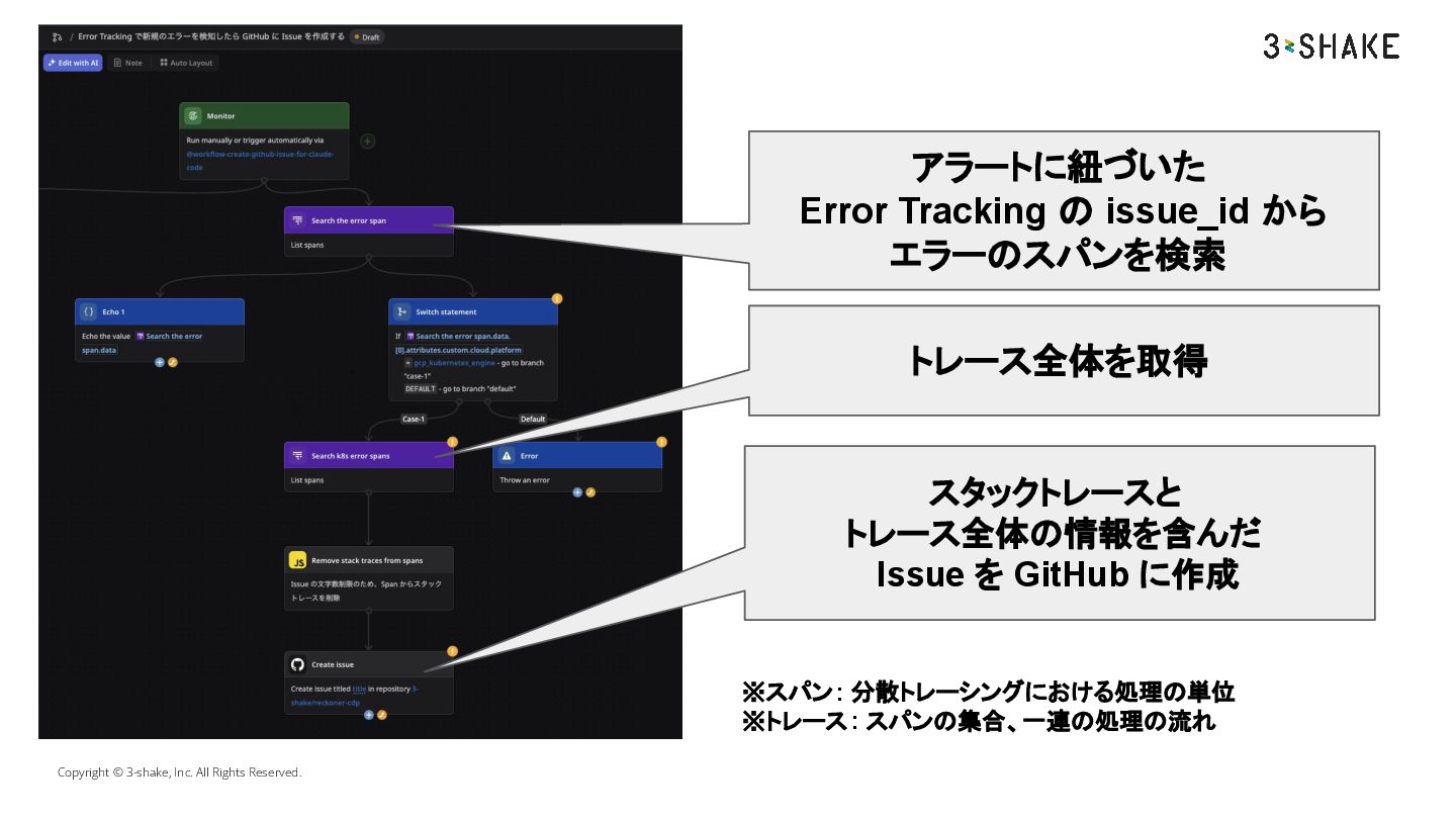 の issue_id から エラーのスパンを検索 トレース全体を取得 スタックトレースと トレース全体の情報を含んだ Issue を GitHub に作成 ※スパン: 分散トレーシングにおける処理の単位 ※トレース : スパンの集合、一連の処理の流れ