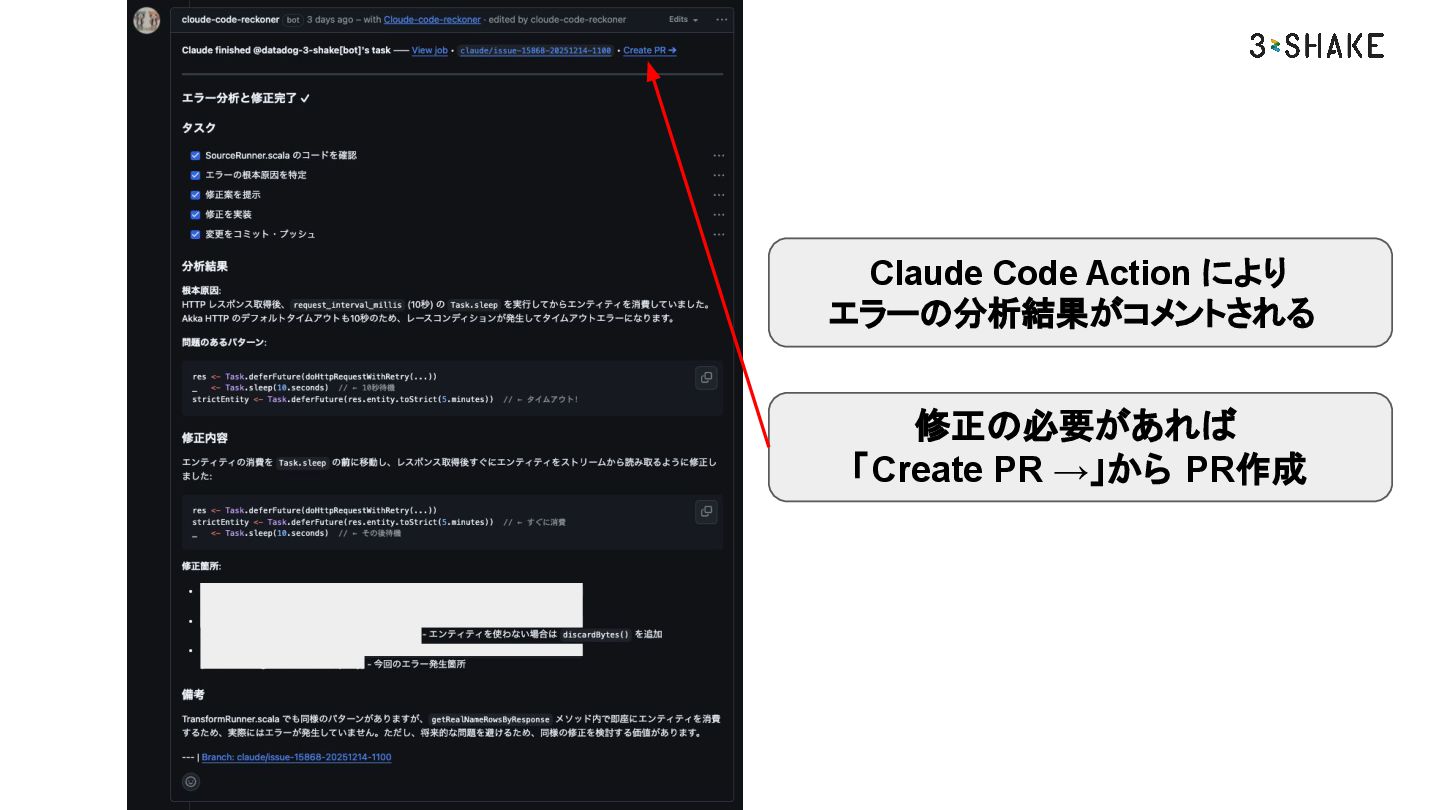 Claude Code Action により エラーの分析結果がコメントされる 修正の必要があれば 「Create PR →」から PR作成