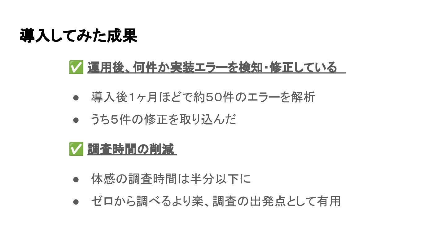 導入してみた成果 ✅ 運用後、何件か実装エラーを検知・修正している • 導入後1ヶ月ほどで約50件のエラーを解析 • うち5件の修正を取り込んだ ✅ 調査時間の削減 •